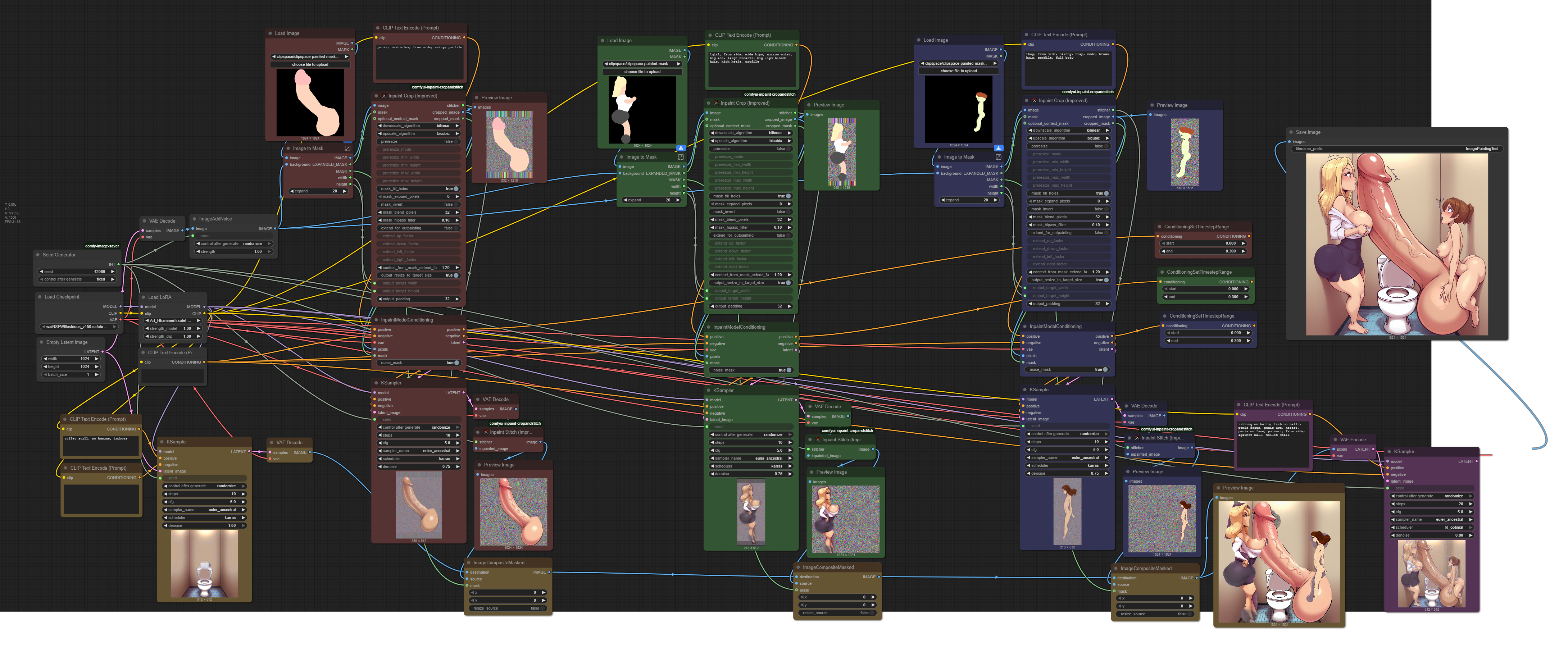 >>11417002Don't know if this was mentioned elsewhere, but this Comfy extension is pretty useful:https://github.com/lquesada/ComfyUI-Inpaint-CropAndStitchIt will automatically crop to the mask you give it so you can gen that area at your target resolution (1024x1024 in my case) and then add it back to the original image (using a different node)I used it for this final edit >>11416068 when I was prior manually cutting out the faces and them up and down and made the whole process incredibly tedious. (It did still take a while because I used images of cocks that I image2imaged and had to manually cut out to paste onto the image)In pic related, I was testing out using this to reface other images (a render by Viiseon in this case) as I like to make custom captions and want to alter the expressions of the image. I would say it worked pretty well, although I have found that you want to set the denoise fairly low (0.50-0.60) as any higher it will make a completely different image (when I was using a face segment and detailer, I found the results were better at denoise 0.75). Also, when using a expression prompt it can get way too detailed (i.e. the lines too sharp, at least for a 3d style) and so giving it more details at low weights like "(angry:0.5), (teeth clenched:0.3)" ended up looked cleaner.I want to do more testing with it as I bet it would be very useful for adding induvial characters to a scene which you could then use image to image on. I was doing some stuff like that a few weeks ago using area conditioning and masked conditioning, but found it limited.Even if it doesn't work for that, being able to inpaint an upscaled gen is quite handy. I started searching for this sort of tool when >>11414817 was mentioning their issues. I was going to make my own to do this same thing, but fortunately it already existed.