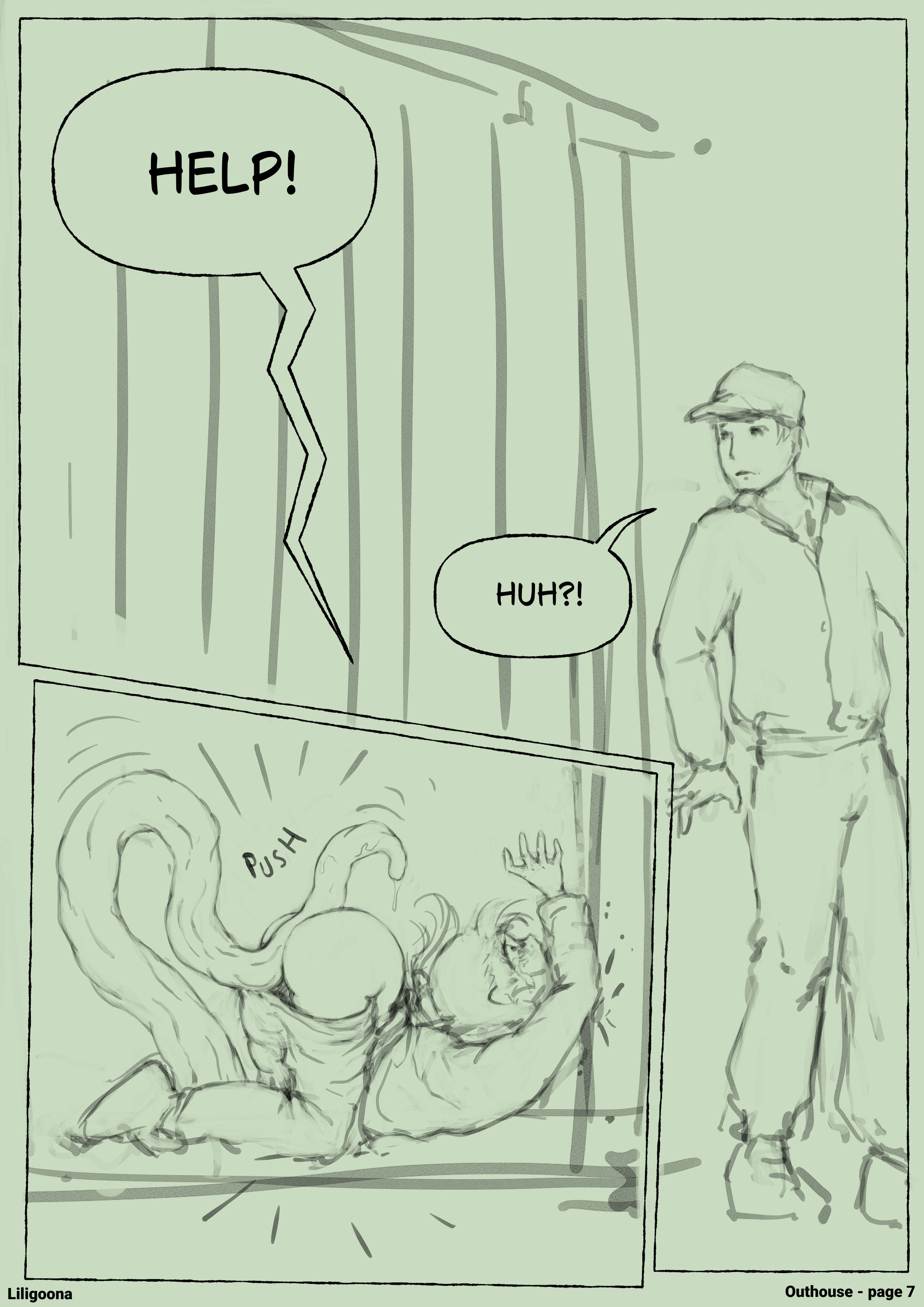 >>11438268I was thinking the guy opens the door and sees her pinned down and she asks him for help, to pull her out of there, but he starts getting horny, and his cock gets hard.... then another tentacle starts gently playing with his cock and pumping it... then his gf/wife gets brutally raped as he watches