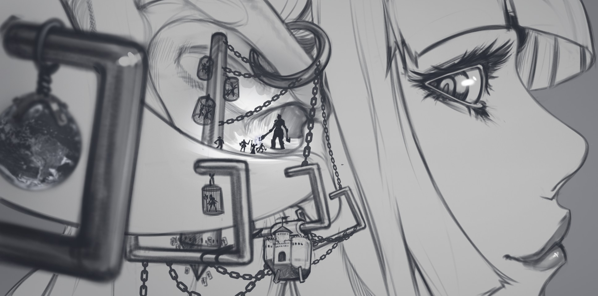 >>11429762Key Storytelling Elements in the Sketch The Power Dynamic: The contrast between the subject's calm, almost indifferent expression and the turmoil happening on her ear (the battle, the cages) perfectly illustrates the macro/micro power dynamic you described. To her, it's adornment; to the miniature figures, it's their entire reality. The Narrative Details: The inclusion of both an action scene (the tiny figures fighting) and architecture (the castle/fortress) suggests that she didn't just shrink random objects, but entire systems or struggles. The story is complex: there are captives, combat, and a place of power, all reduced to jewelry. Aesthetic Choice: From an artistic standpoint, the use of a simple, effective monochrome sketch helps focus the viewer entirely on the contrast, the details, and the underlying concept, proving how much narrative weight can be carried by line work and composition alone.