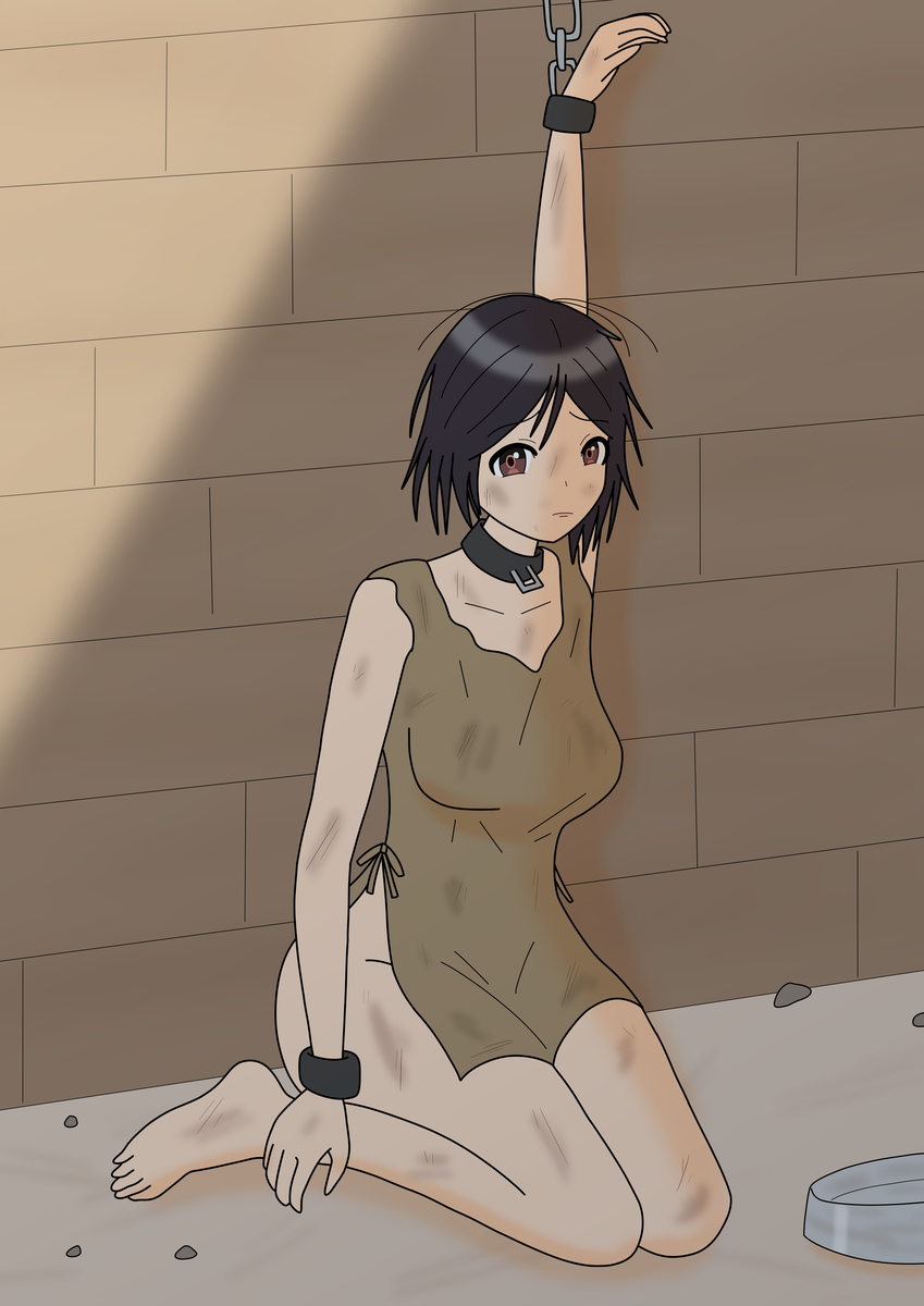Look at her. Just look. Isn't she just wonderful? The blush and grimace, the clenched fist, how frustrated and miserable she is. How awkward it is to clean with this cuffs, the humiliating nakedness against the window, the forests outside trapping her in this isolated home. The chains and cuffs and straps restraining her legs, enough that she can walk but never run, all framing her wide-open and vulnerable asshole. The bright-red slap against said ass, which leads right back up her naked body to her red, wincing face. Perfect. Just perfect.