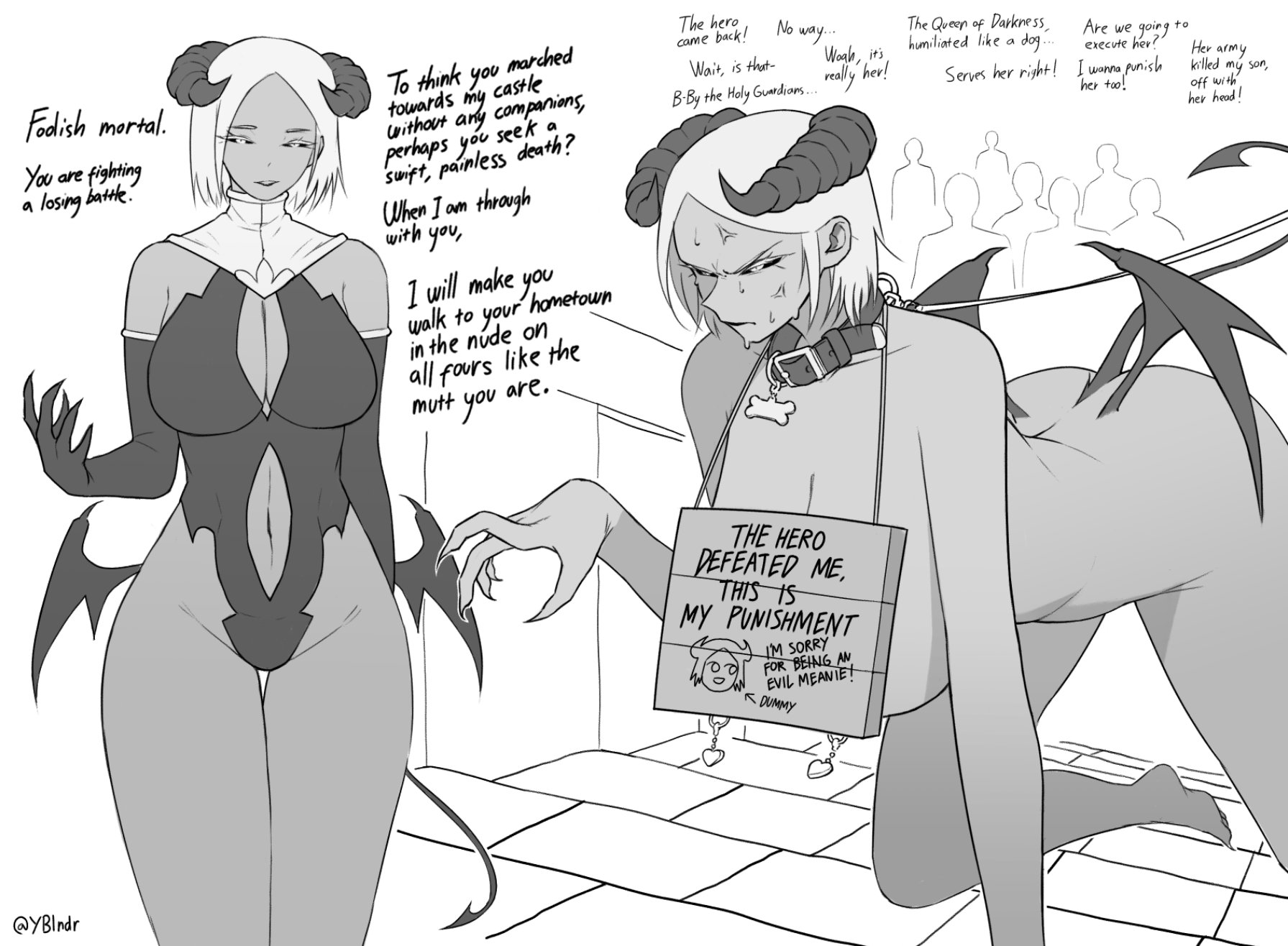 >>11437290>Hear your fan club back there, "Queen of Darkness?" That's everyone in the world. Be a good little bitch and maybe your master won't feed you to them.Meh, part of the appeal is to let them have some fun too. Besides, what is she gonna do about it? Create more excuses to punish her?