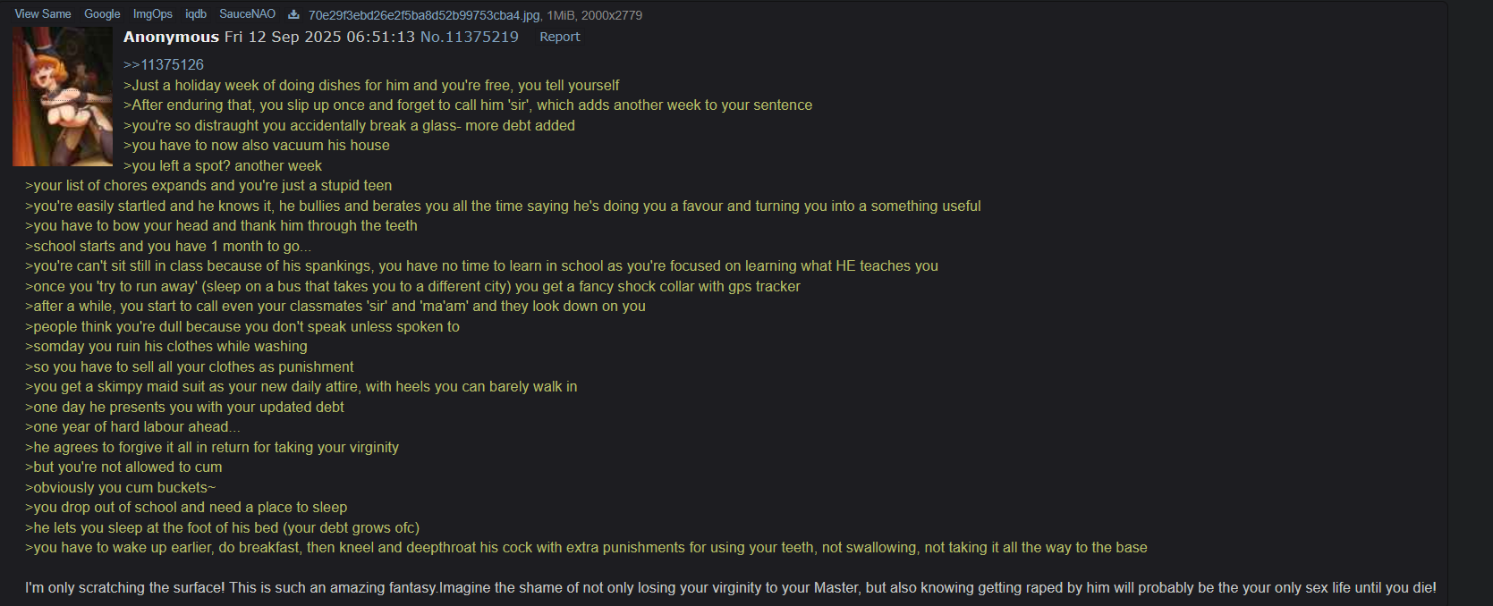 >>11432862And also>tip boxIf I want to tip the owners I'll give it to them directly, the only tip a slave should ever get is the one going down her throat.(Also, it's almost criminal how underrated arukime92/jingai is as an artist. I haven't seen such a perfect depiction of "slave who couldn't imagine herself anywhere else" from any other artist.)