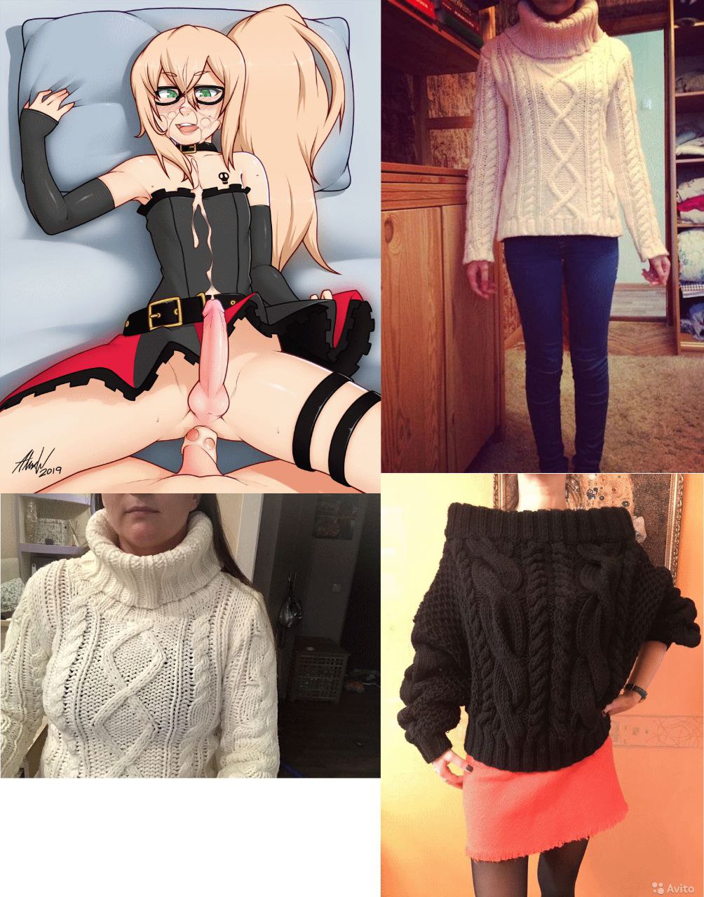 Requesing anal missionary sex with cozy femboy and lots of cum. He dressed in white oversized turtleneck sweater and black knitted offshoulder sweater together (as reference)