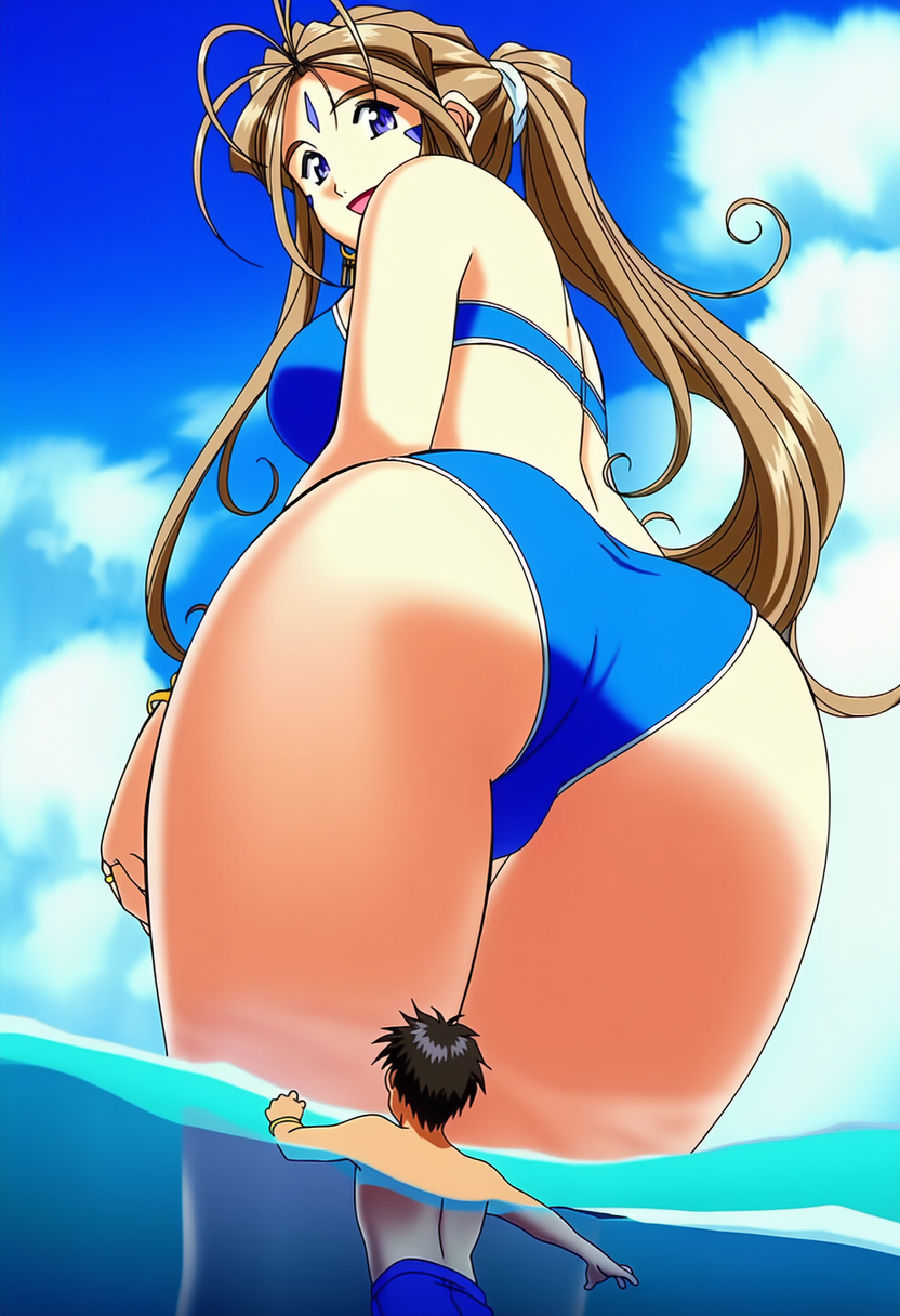 >>11433678Requesting Giant bikini clad Belldandy in the ocean. The water is up to her thighs. Her back is facing the viewer but she's turning around to look at tiny Keiichi swimming towards her. She is smiling and encouraging him.
