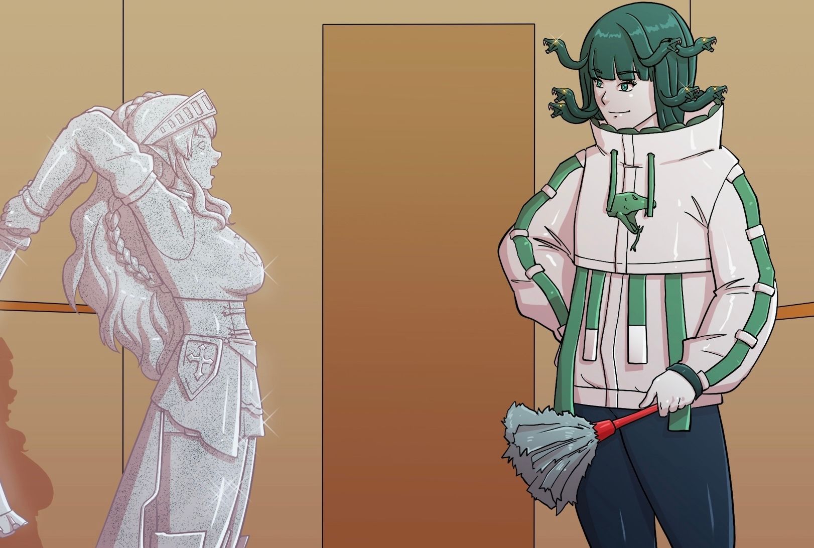 For Athena there, it looks like she's banging on something. The locked door to the room that was flooded with petrifying gas? The legs don't match that, though.