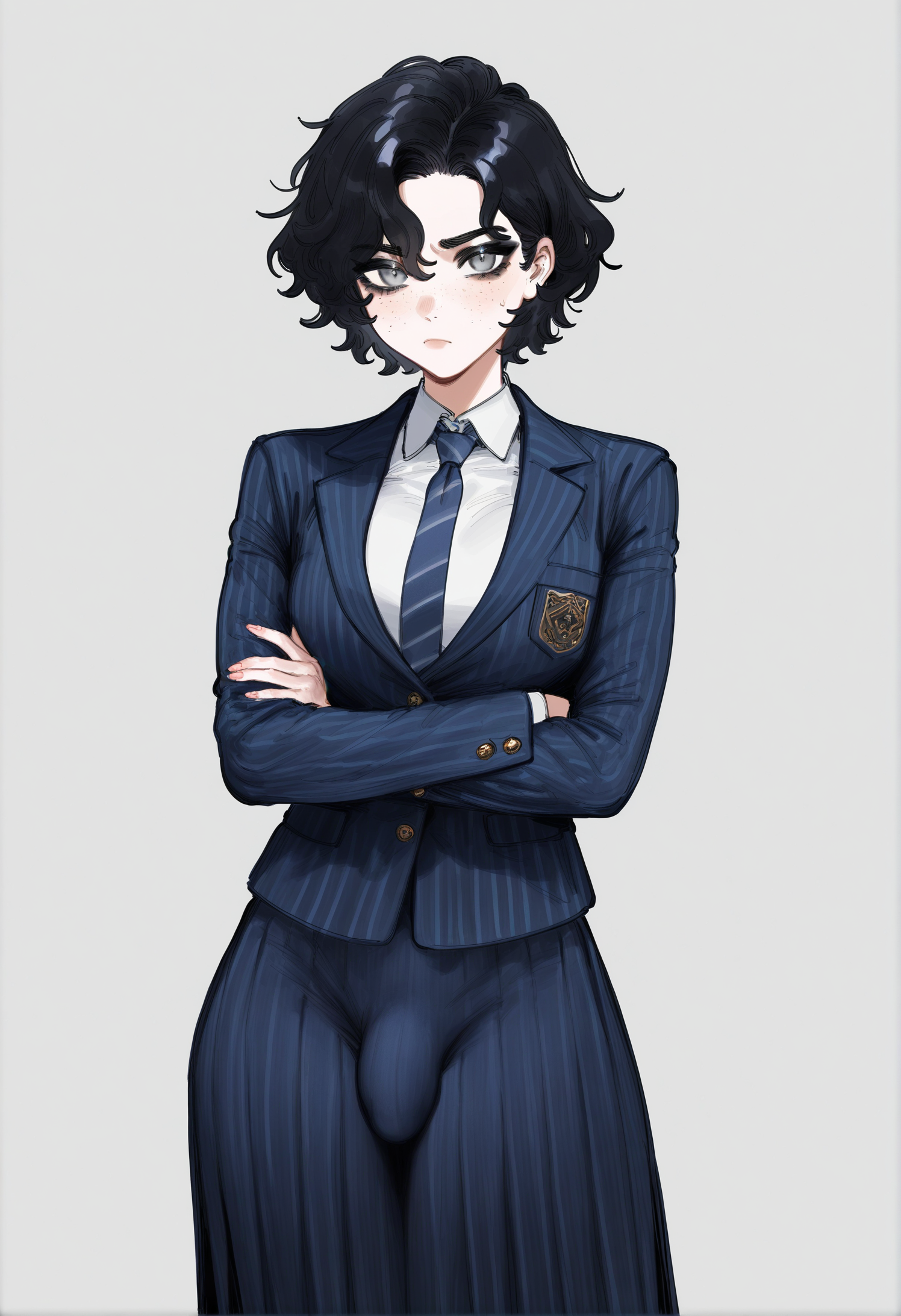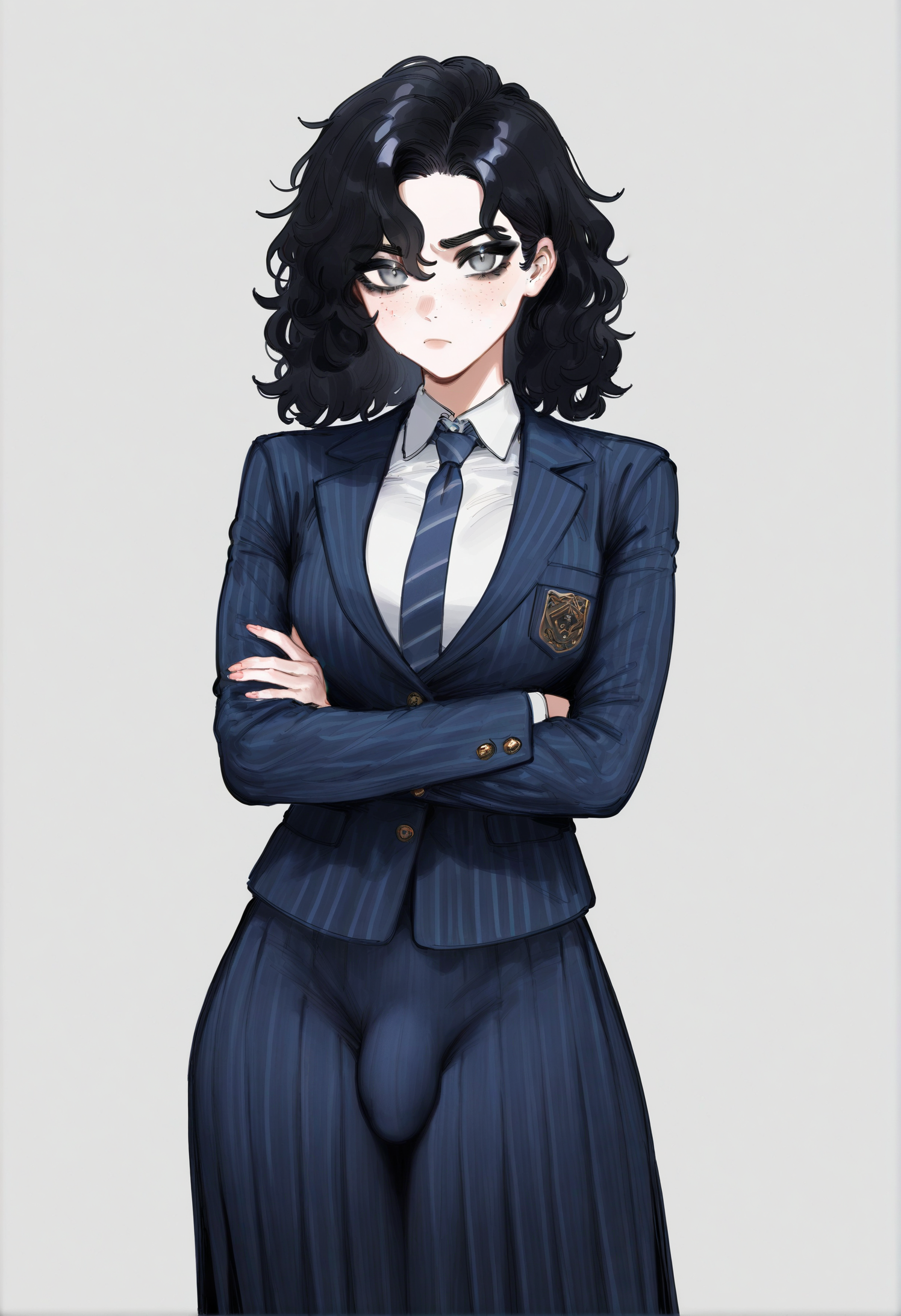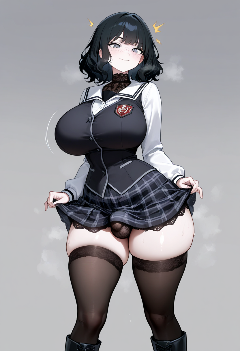 >>11444421>>11444416i tried this a little bit better:masterpiece, best quality, 1girl, 18 years old, tall girl, black hair, medium hair, proud expression, wavy hair, grey eyes, sharp gaze, athletic, hourglass figure, big breasts, narrow waist, wide hips, big ass, noble face, round cheeks, pale skin, freckles, dark academy uniform, high lace collar, black vest, school insignia, white blouse, black skirt, tartan skirt, black stockings, black boots, silk underwear, bulge, bulge under skirt, futa, highres, absurdres>>11444421I really like this one. Can you make her hair a little bit longer pls? I'd do it myself (i'm trying seaart.ai) but i'm failing miserably.