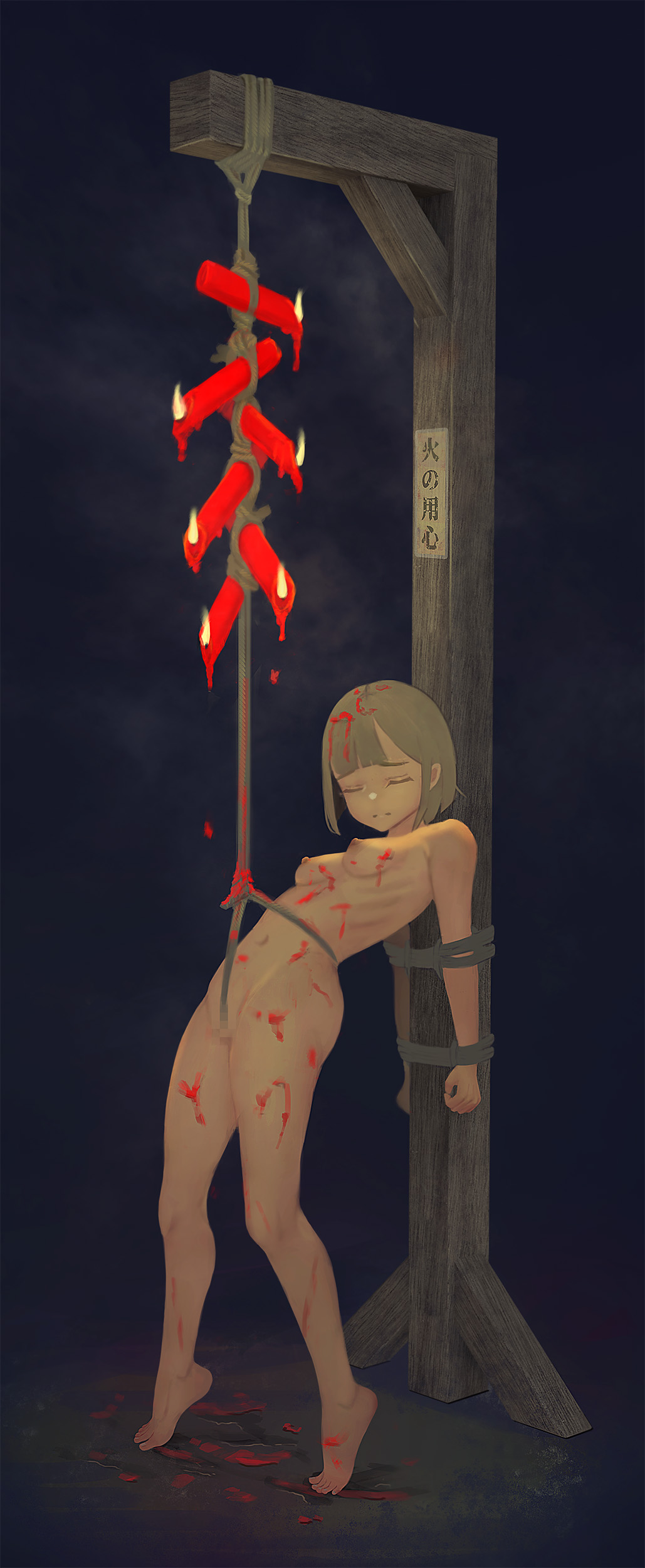 not only does she have to stay on tiptoe but every time she flinches from hot wax hitting her it jiggles more hot wax off the candles