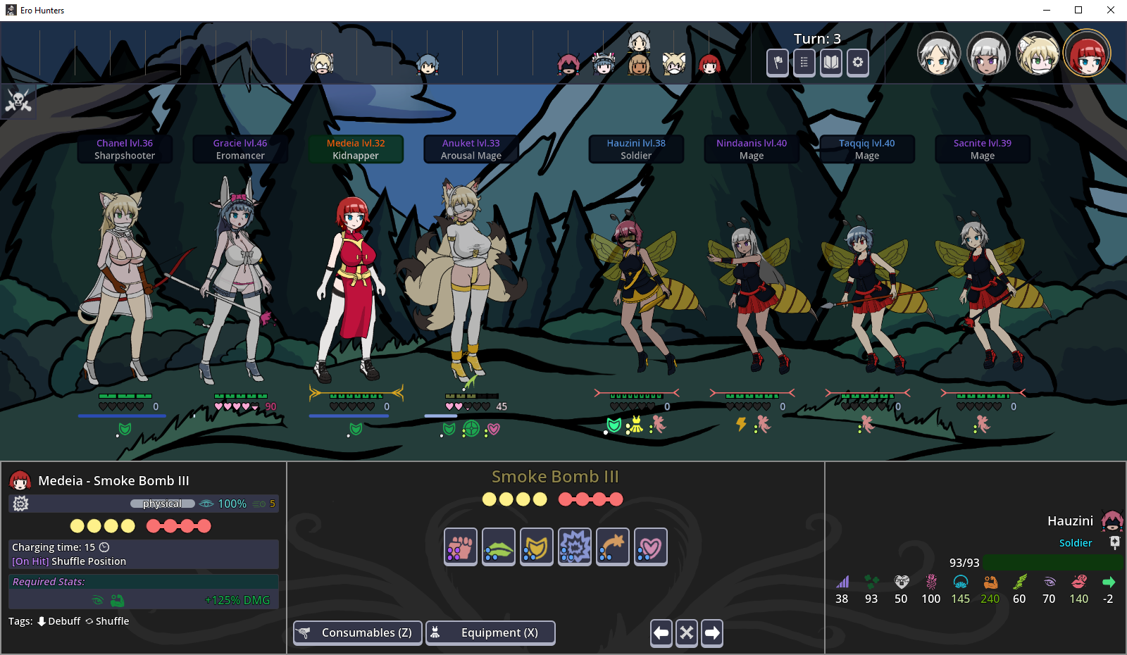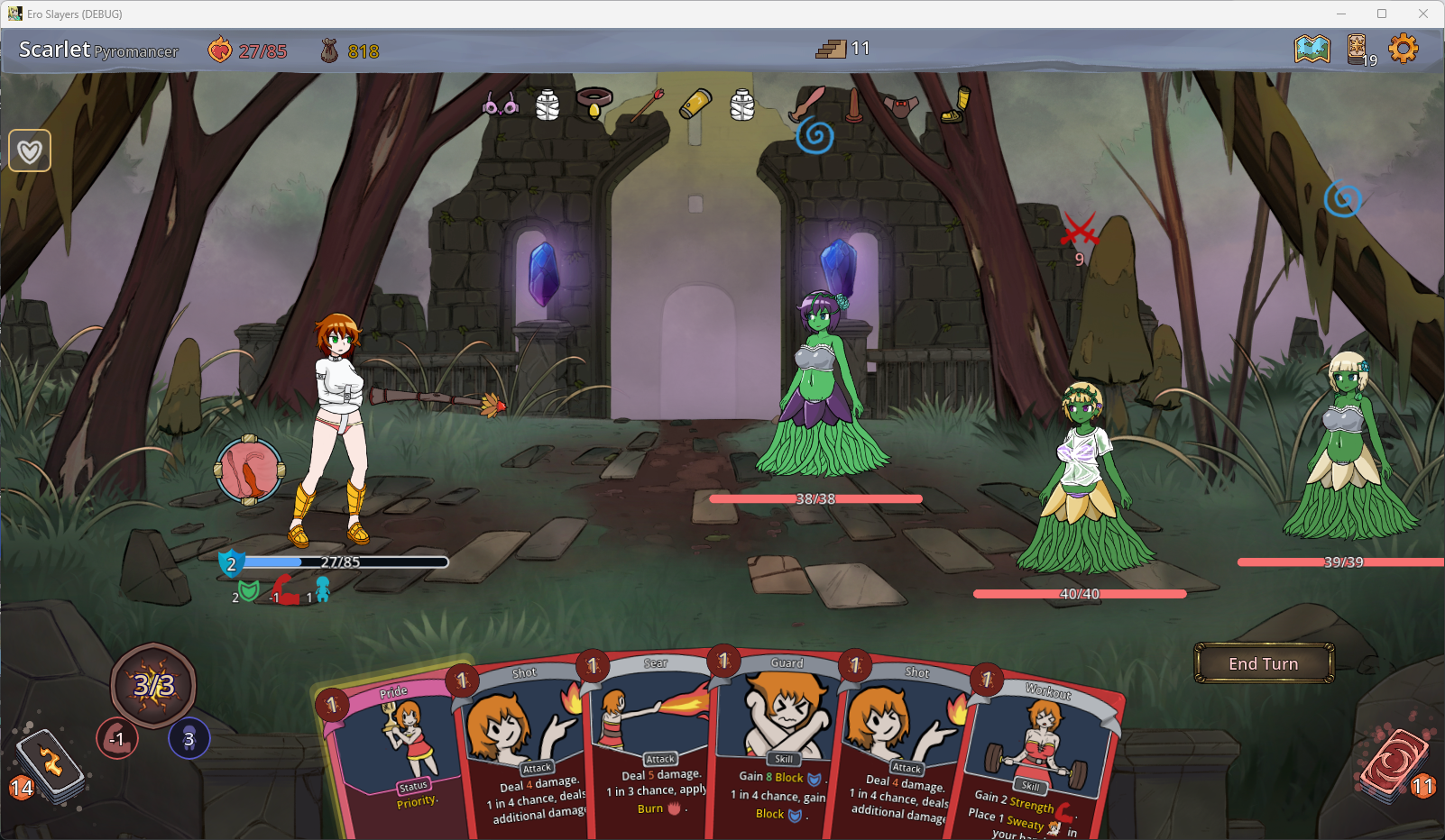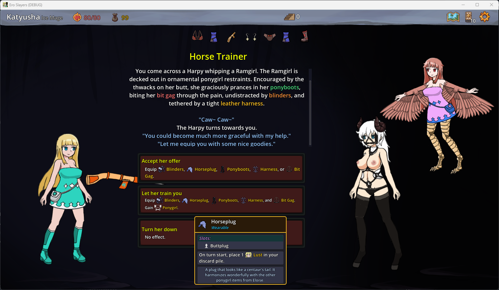 Another issue is that it's difficult to have "scenes" in DD since it's not intended to be a hentai game, so anything lewd ends up as flavor text or a custom combat animation. I think you would probably want to move closer to a total conversion mod that can support that kind of thing while keeping DD combat. Most of the work in the mod is creating the assets anyway so I think that can probably be done later or for a future game. In general probably have a look at ST Hot Dog King's work to see what is possible without creating a custom animation for every combination of player characters and debuffs. E.g. Para Ark 2 displays a generic-ish animation for every attack and only has some minor variation between participants. And there's a new exit8-style game he's making atm where he's experimenting with a physics engine that allows you to incorporate any size asset into a scene. There's a lot you could improve, but I get that the current state of LLE is probably due to limitations of what is easy and what is hard within the constraints of DD vs a custom engine.