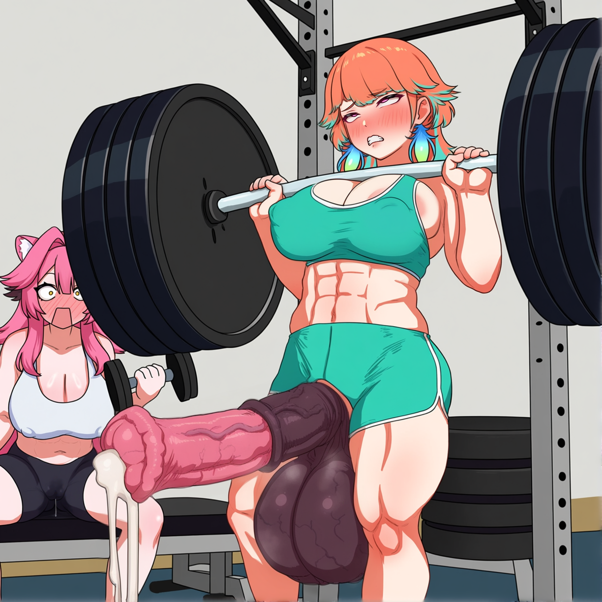 >>11462914requesting hyper horse cock takanashi kiara in a green sports bikini working out at the gym while her genmates look on in awe as she leaks out a ton of cum