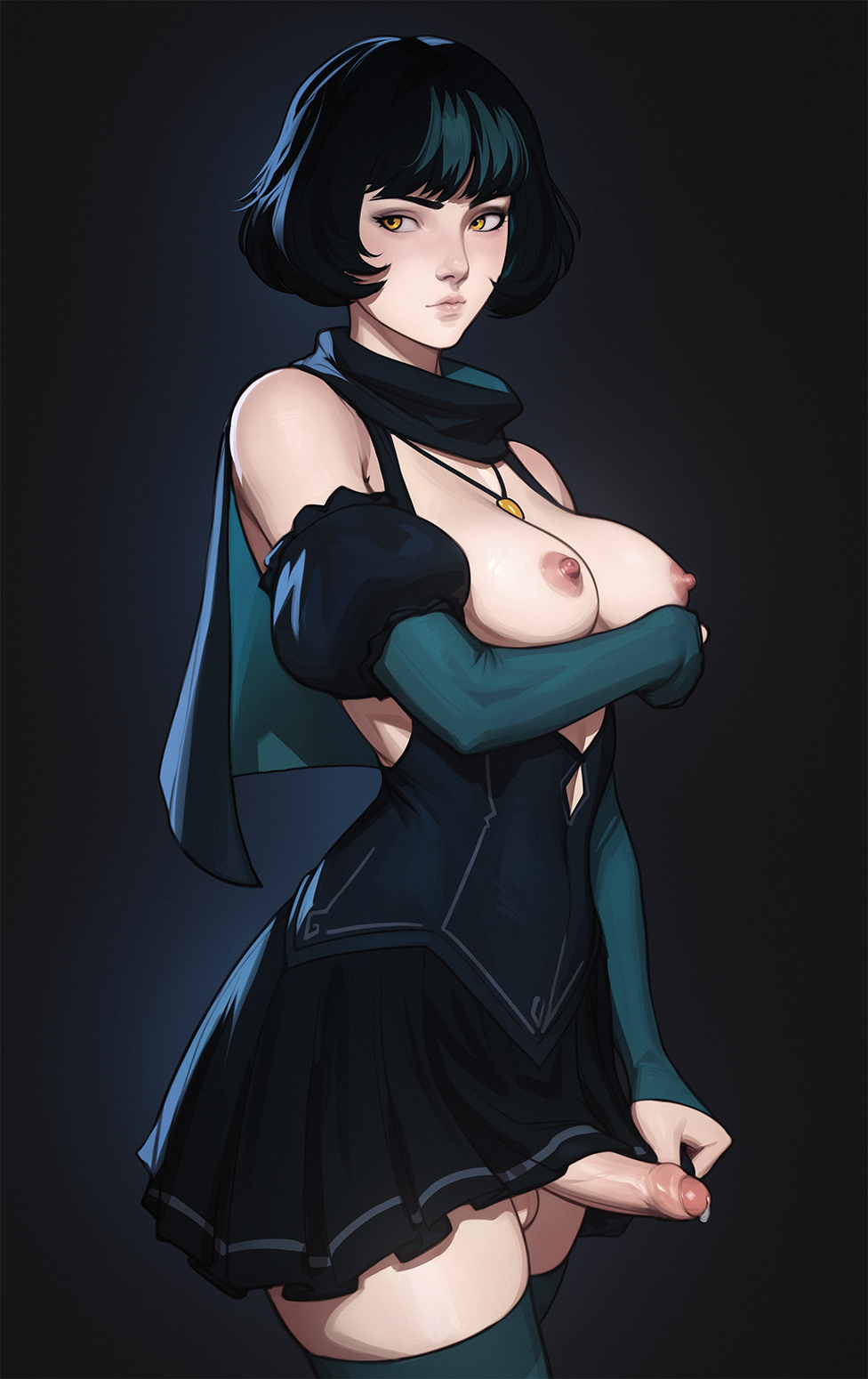 Requesting a hyper futa hijabi with 2 equine cocks in a single sheath like this:https://files.catbox.moe/nsuo1i.pngMake her boobs as big as in the reference or a bit bigger.Finally, make her casual about it, like greeting someone with her cocks being flaccid and leaking some precum while pretending as if nothing wrong is going on.