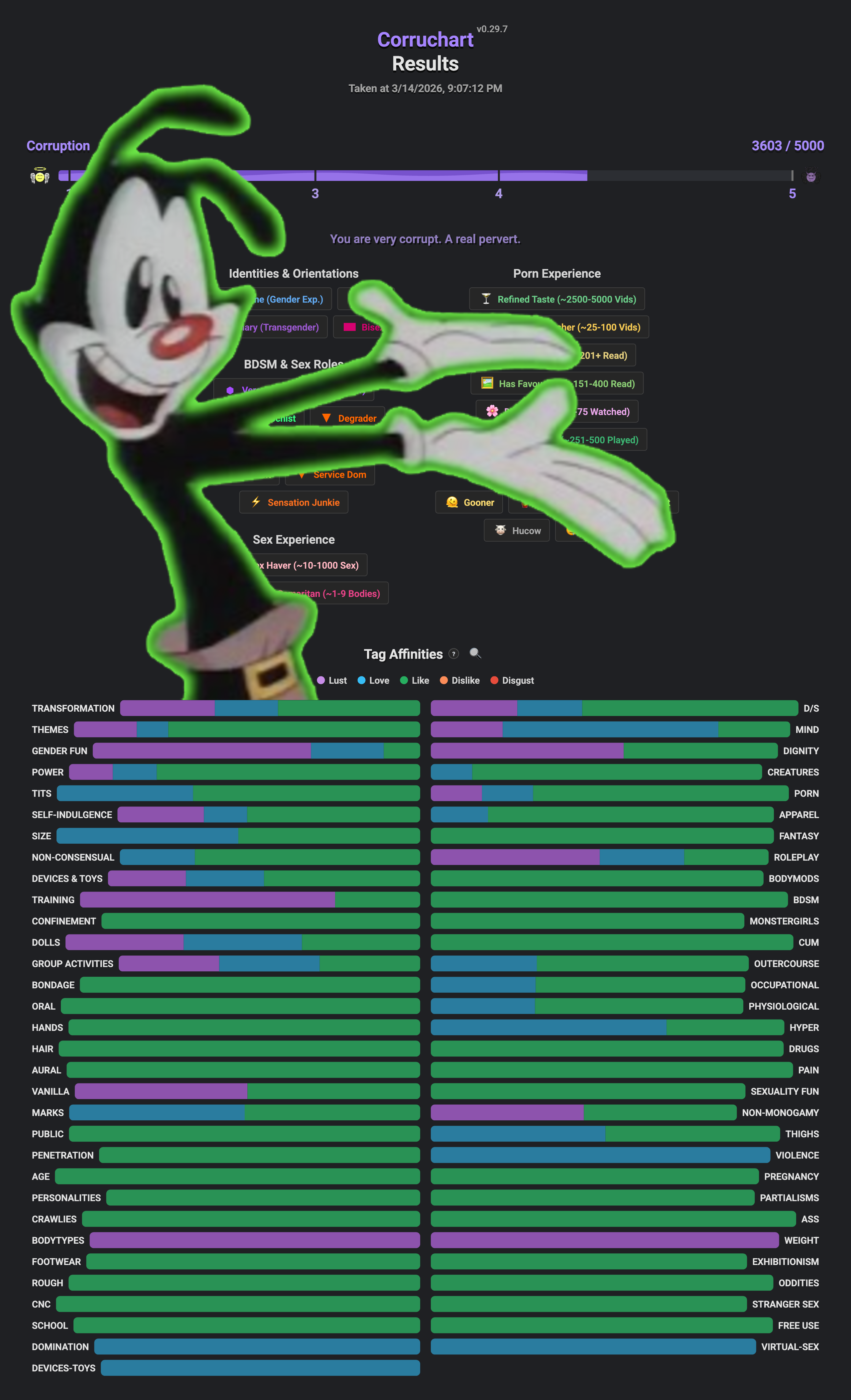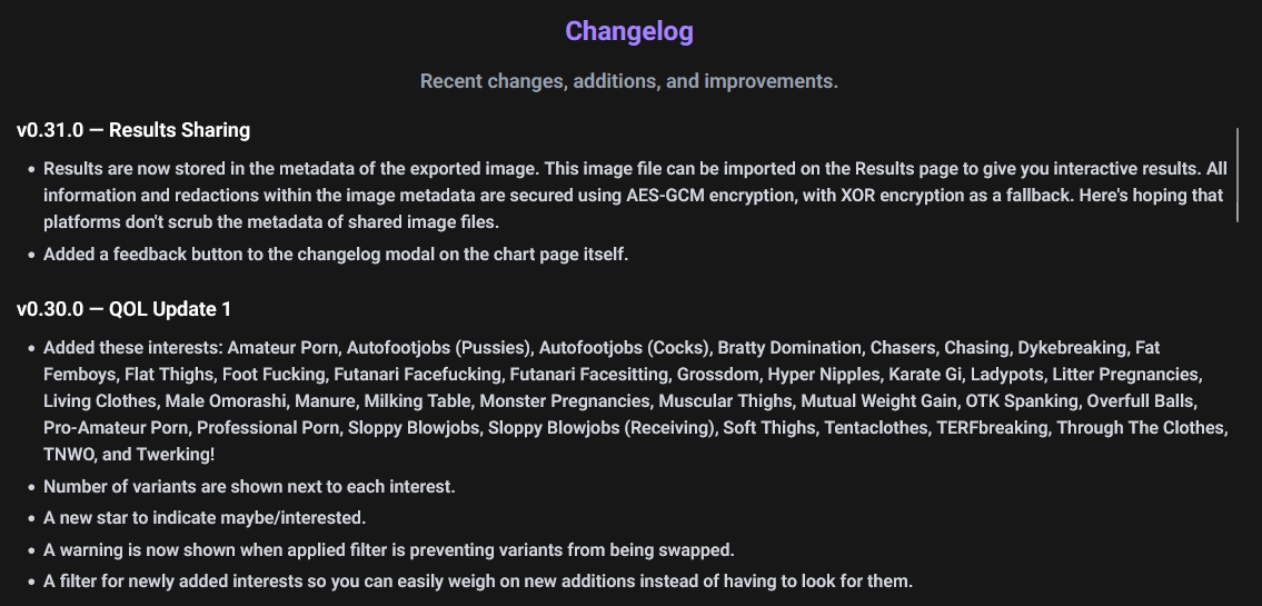 it is i, chart-anon, after many years (nearly 10), i have returned to you with a far better tool to share your fetishes and interests. send feedback if you want on this thread or on the form in the tool itself. make sure to read the guides and most importantly have fun. ´◡'http://corruchart.com/