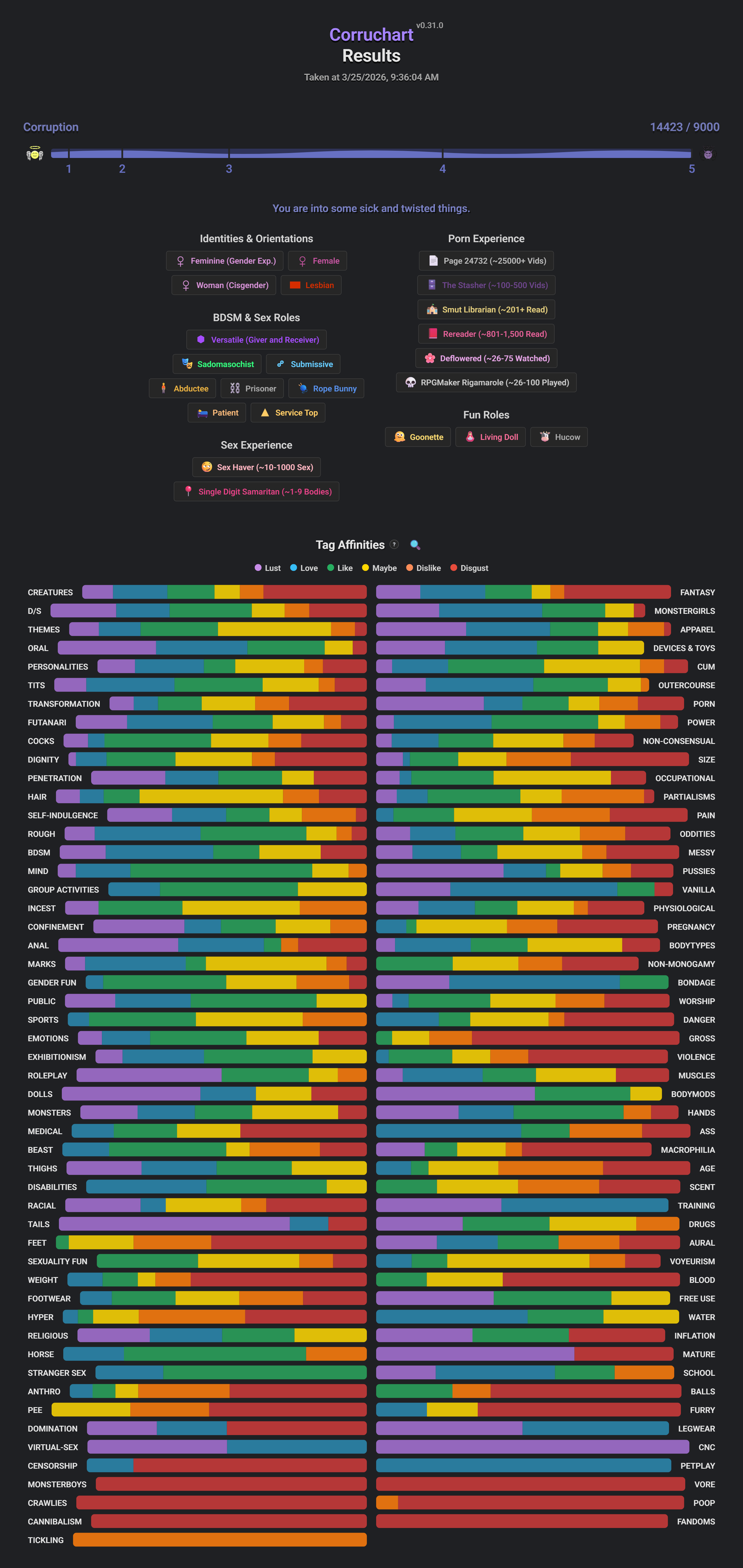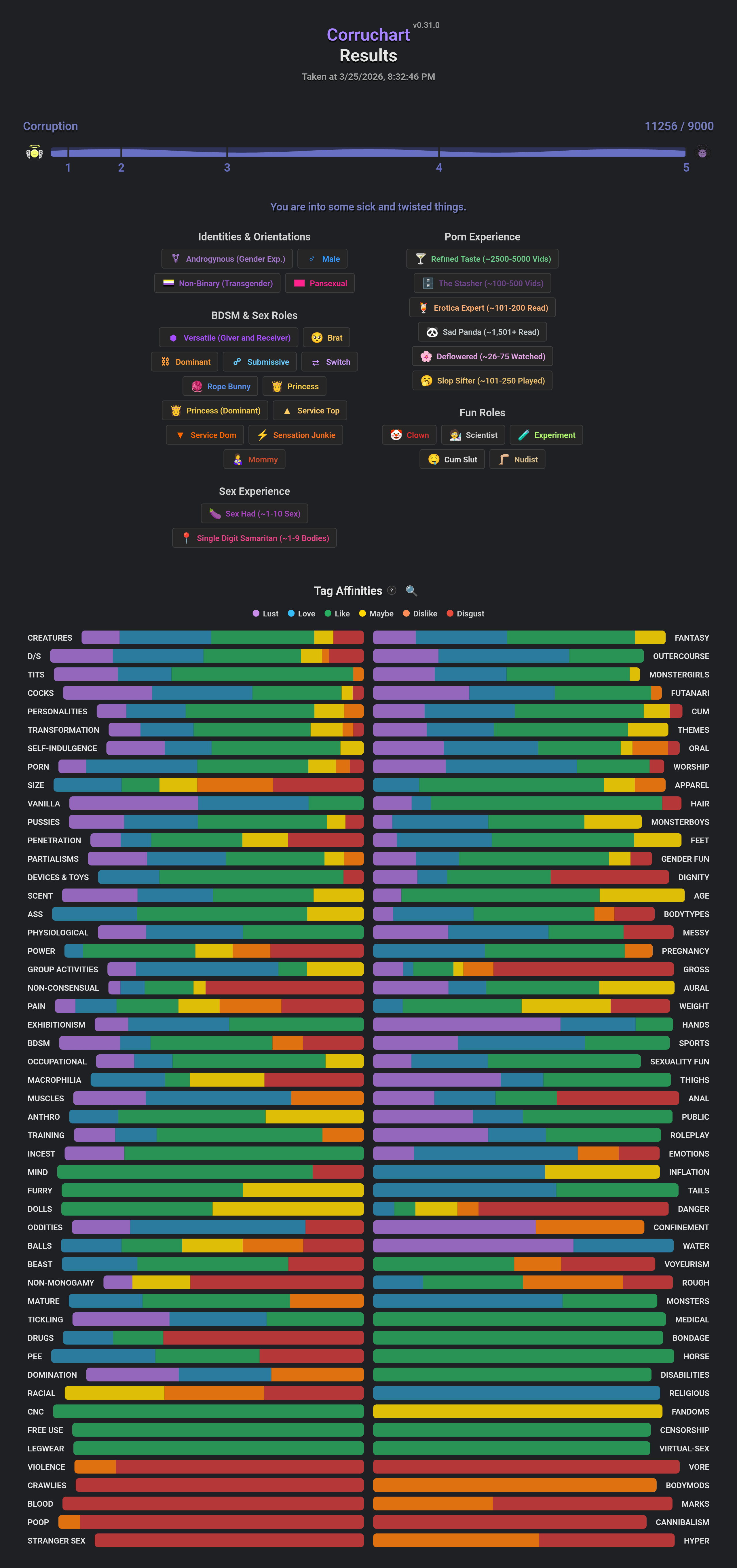 >>11482231Some myriad observations/complaints/whateverSome of the entries had swap icons that wouldn't work, no idea if there just wasn't an alt or it wasn't workingI could be completely delusional, but I FEEL the actual corruption score needs a rebalance. I'm mostly someone who gets very passionate about pretty vanilla things, so I wouldn't expect to nearly cap out a score like this. It could be my many empty scores on stuff I just can't be bothered to specifically worry about, too be fair, but as someone with basically nothing in any noncon, violence, scat & piss, high concept bdsm ect, nearly capping the score is... surprising. I don't even want to eat you, just your cum.As a color blind shit, either love or lust need a slightly different color, and either disgust or dislike need a different color. I had to count clicks for the most part. Some redundant/confusing entries. I'm not sure what the difference between goblin monstergirl/boy, and goblins is, and these options end up confusing.There really should be giving/recieving alts for a lot of acts. If there can be gender specific alts for like 30 subtypes of monster, there should be an alt for "likes giving blowjobs, likes getting blowjobs", you know?The results could be a bit more granular. There's like 30 monster questions, and not a soul can tell my love for goblins, and indifference to centaurs, and my preference for small cocks is completely masked. I feel there's a glaring omission in porn, in the form of single images, like what would be posted here. In reviewing the form, I think there are some entries that never show up using broad tags alone. Either that, or I was blind as shit because a few things I was surprised wasn't on it, actually were now that I'm browsing by narrow tags. Again I could just be blind. Actually might revise results. But if the narrow tags are more "opt in", the broad tags need to cover everything