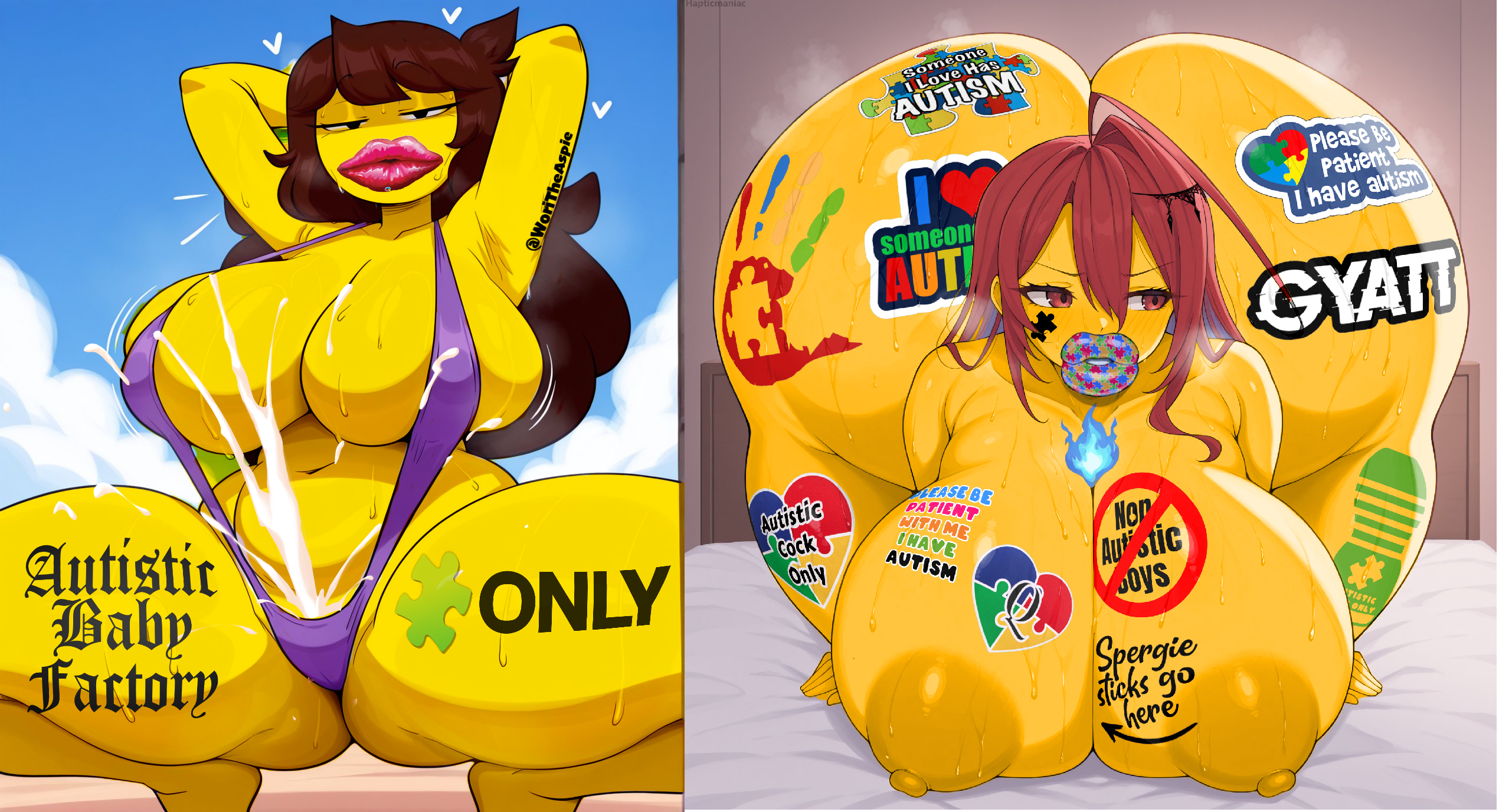 >>11490171that is also referred to as "aspie gooning/gooner" which ironically enough started from someone with autism fetishizing the fact he had autism by "ironically" using the autism speaks logo/marketing since they had very shallow world views regarding autistic people even going as far as to suggest eugenics/killing them thus aspie gooner/gooning was born making fun of them while also enabling a strange new fetish.features of said fetish include:>fetishizing mental disabilities (mostly autism)>emoji's/emoji girls (or just editing anime/furries with yellow skin)>puzzle piece symbolism>having "handlers">"2D only/tooning" JOI>verbal praise/abuse for autism specifically to point out stereotypical behavior of autists (no eye contact, stuttering, lack of social awareness, etc)>huge lips>deep-fried/high contrast colors.>baby talk/mommyBasically it's like race play/BLACKED only for retarded people.
