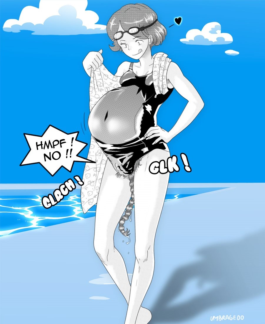 Back view of a mommy character in a naked apron cooking a meal while the character she unbirthed is: peeking out of her womb to catch some fresh air; or shown resting inside her belly.