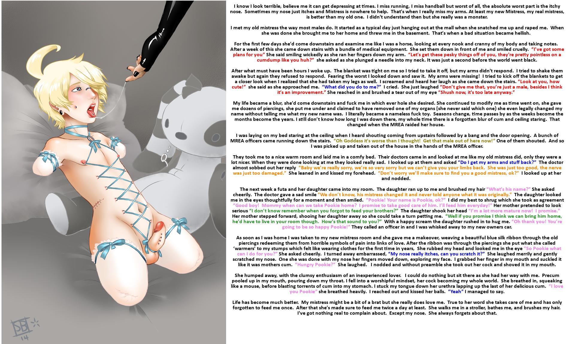 >As you cross the threshold of the apartment, a chime resonates from your exosuit. 15 minutes. That's all the time you have to do whatever you need to accomplish. Once that timer is up, you'll lose all control over the exosuit limbs that resemble the biological ones you previously had. From there, the exosuit will walk you to one of the preset locations in the apartment and detach from your limbless body. Sometimes it's the couch or bed, providing a comfortable laying position. Sometimes it's the hard floor or carpet. And other times it's a chair at the dining table. Regardless of where, the expectation for you to sit or lay in place is the same. To wait until he returns.>When he does, you'll be happy to see him because you know the real fun will begin. Outside, in the exosuit, you can still go about your life, working at your job, going shopping, spending time with friends, etc. But here, in his apartment that you share, you are his limbless toy. Completely helpless and subject to all his whims.>And you wouldn't have it any other way.