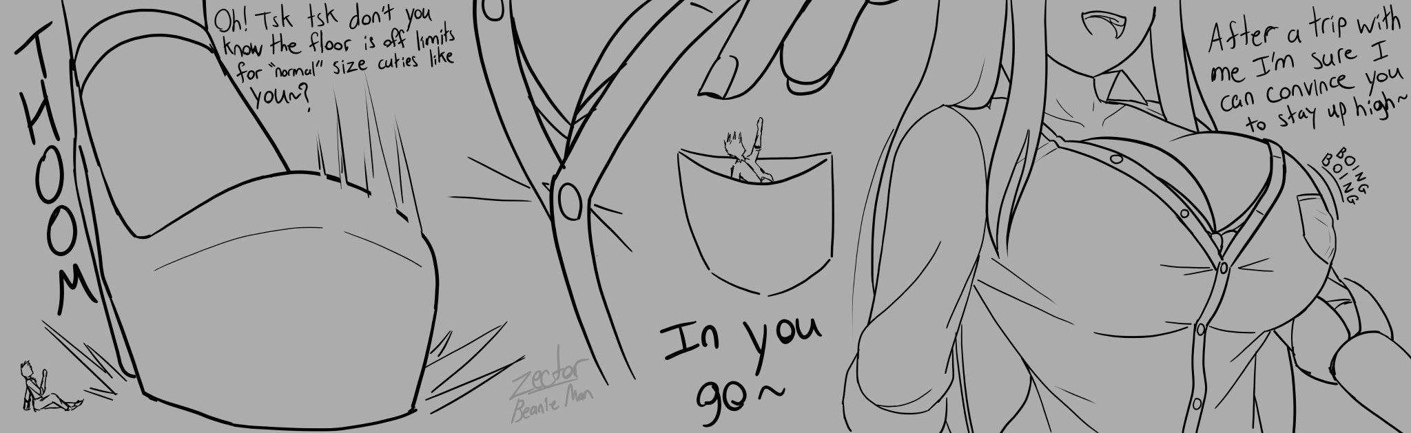 A greentext for something I just started writing:>femme fatale assassin/secret agent type wants to retire>but she's made so many enemies, she has to make sure she gets out with no one following her>reaches out to a tech wiz type who's been her handler on several previous missions>together they set up one last job>the mission goes wrong as intended, and she "dies" in the explosion>as she's walking off to her new life, she thanks the handler through her earpiece for all his help >he says it's been a pleasure, and that he's a little sad to say goodbye>then he hears footsteps outside his lair>cuts the connection and powers off to be as quiet as possible>"Actually, it's not goodbye yet. There's still one more loose end.">it's her voice, but it's not coming through the headset>massive hand smashes through the wall and grabs him>"Ah-ha! I knew you were a tiny!">she holds him in front of her cheeky grin >"See, I knew that if I could track you down, then others can too. So, for my safety, and yours too... you're coming with me!">drops him into her cleavage and starts walking away to her new life>"Lucky for you... I'm into little guys, so you can join me in my new life as my boyfriend!"From there, I'd try to straddle the line between "she keeps him close for his own good," like protecting him when assassins track them down, and "she genuinely gets off on the idea of kidnapping a tiny and making him her pet." Ideally they'd work out a healthy relationship and stop some evil spies in the process.