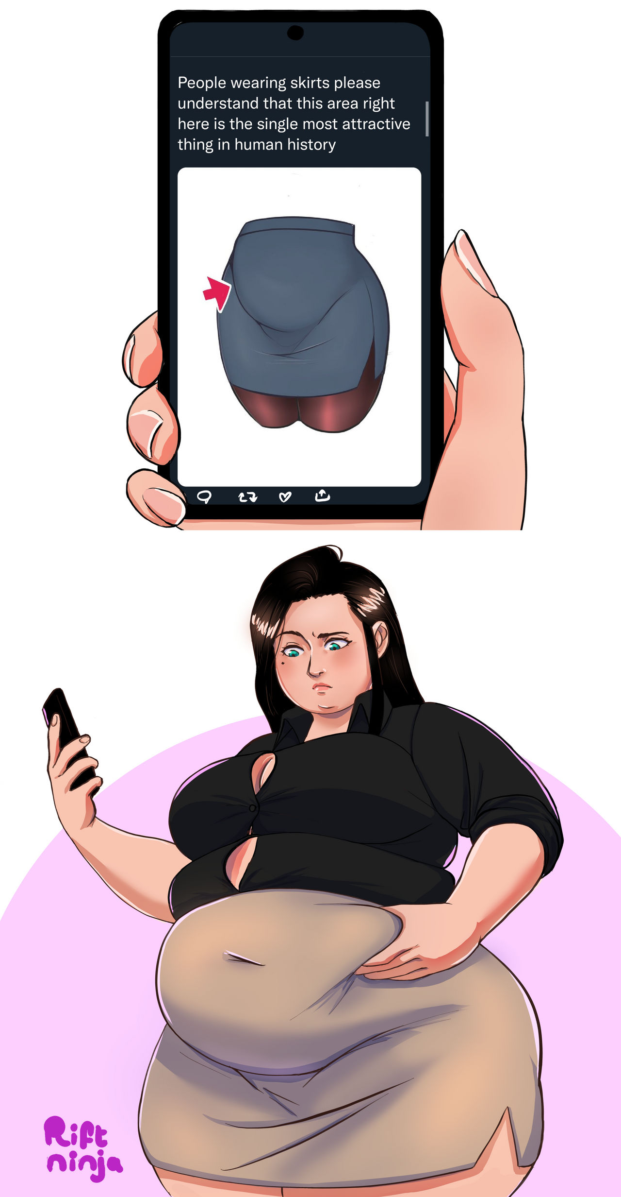 >>11487815>You could just comb these threads as well as some on bbwchan for content you like and post once you got enough.That's a good idea, but I want to be careful about being normie friendly, because I'm definitely in the deep end of this fetish.>It also would help if you followed plus sized influencersAlso a good idea. It helps that they already try to appeal to the mainstream.I also want to throw into some text posts and funny memes and stuff, but the problem is that I'm not particularly creative. If I have to steal memes, where should I get them from? I know KYM has NSFW/suggestive stuff.I also don't know how to growth hack a Twitter page. Is it just a matter of using the right hashtags?>>11487821I'm thinking art that portrays specific aspects of fatness and weight gain as something fundamentally attractive, both directly and indirectly. This art by mochimochiland is a good example, because it focuses on something that's typically considered unattractive, weight gain, and an expanding belly, and portrays it as desirable. I was thinking the page would share stuff that's like 40% chubby sized, 40% BBW sized, and 20% SSBBW sized.