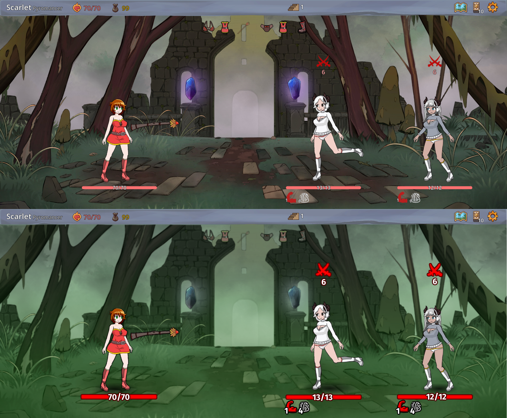 To elaborate on these, here's another little mockup on the background/foreground and combat UI elements (note: couldn't be arsed to tweak the top bar area). Original on top, edited on bottom. I've desaturated and defocused the background and did some color overlaying. For the UI elements I primarily just made them bigger and increased contrast and border sizes. The font I used here is Fira Sans Bold (good fantasy game font IMO). I also added blob shadows underneath the characters as a little test. The UI colors aren't finished suggestion, but more just idea of what kind of direction I'd like to see them take.