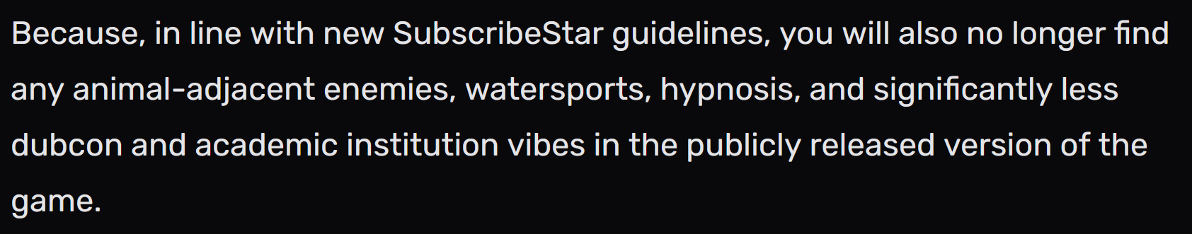 Trap Quest just deleted a whole bunch of content to fit with Subscribestar's policies (there's an official workaround to still access it but who knows who long that's gonna be supported). Lewd gaming is in a sorry state right now.
