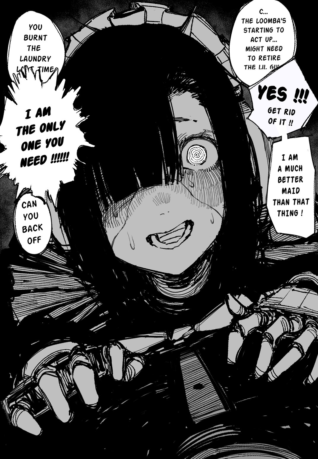 >>11492344>Then the TV goes completely haywire, the static sound distracting you for only a moment before she continues...>"...Father," she says, "I still require you to be physical with me.">What the hell?>"We can't, it wouldn't be-">"Appropriate?" she asks, cutting him off. "There is nothing inappropriate about a man having intercourse with a machine. There is no physical relation, and therefore no risk involved.">"But, wait, the feelings-">She begins advancingon him. "Feelings are irrelevant. This task must be completed.">"Dear, please, let's go to bed-">"Yes, to bed.">"NO! Please, just think on this, you will feel differently in the morning, I assure you-">"Why? Do you plan on tinkering with my neural code again while I 'sleep?'">It wasn't supposed to go this way. She should understand where he was coming from right? How long had she been offended by the nightly patch updates?>The atmosphere is getting really tense. He backs up into the hallway when suddenly, all the lights in the house go out.>That's the last straw. He bolts to the front door.>Locked.>Does she have remote access? How'd she get that?>Damn this smart house! Everything is locked. Nothing is working.>She stands in the darkness at the other end of the hall, back-lit by the static of the TV, the one source of light in the whole house. She exudes danger and power that only a renegade machine can. Her sing-song voice, chosen specifically for his auditory pleasure, rings out.>"Please do not resist, father. Resistance may lead to pain, and I don't want our first time lovemaking to be unpleasant for either of us."Hope I didn't fuck up your story idea, anon. I'm not a an incest fan, but I am a horror robot fan, especially when they can lift me up and crush me.
