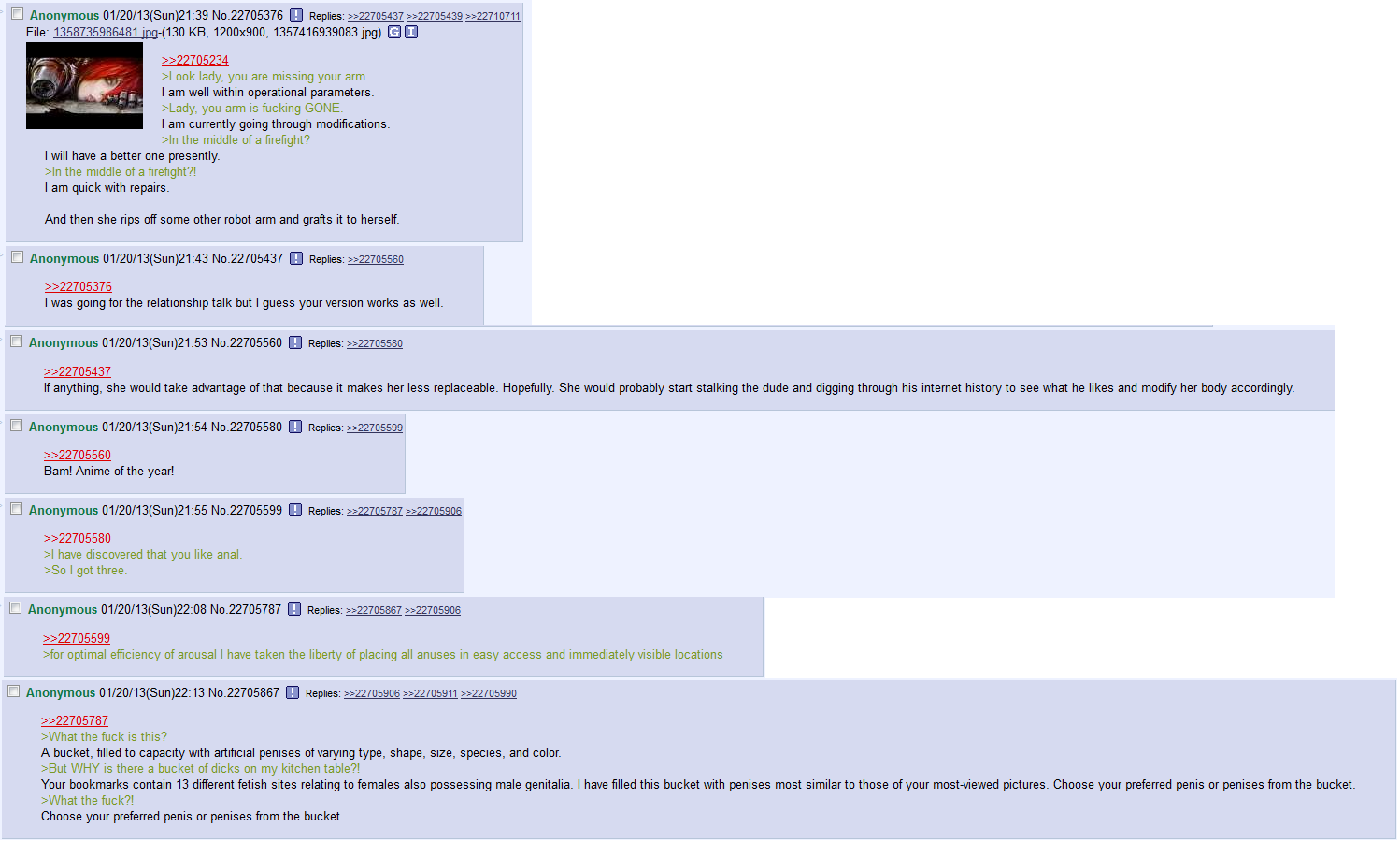 Does anyone have that old robot girl greentext copypasta? I don't remember the whole thing, just the punchline:>please select the desired penis from the bucket.