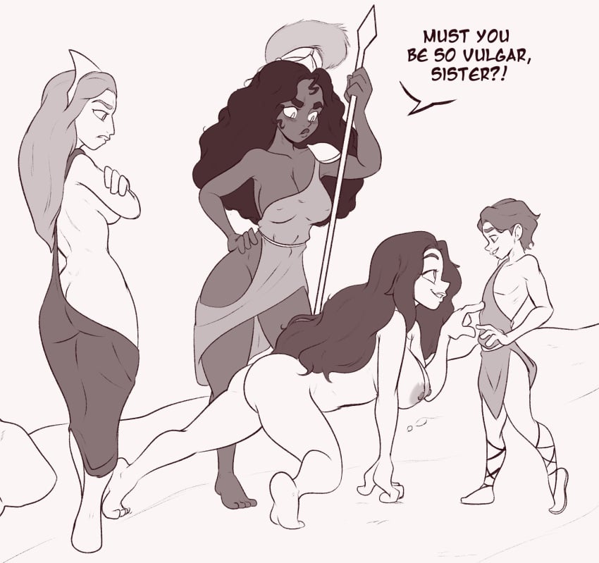 2. Men are shorter, weaker, and lack body hair, but are much more hung, much more virile, and much more resistant to the elements, so being forced to be naked constantly doesn't have the practical concerns that it would have in real life. Meanwhile, women are taller, stronger, smarter, lack body hair, have much bigger boobs, and are much more fertile.