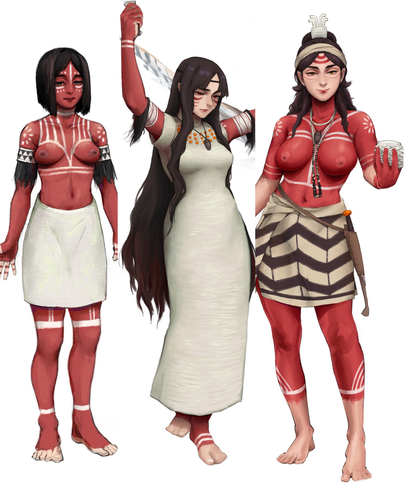 The wild people: the most extreme divergence from normal human baseline. They've been practicing deliberate eugenics on themselves for thousands of years. The sexes are about the same size, and they're beastly huge. Unmarried women almost look like beardless men. Married women look like a muscular women fetish thread, big muscles and big tits. It's the sex that changes them. Lots of leather and personally done weave. Good footwear. Gear practical for living a mobile life. Men will be tattooed with their owner/wife's symbols.