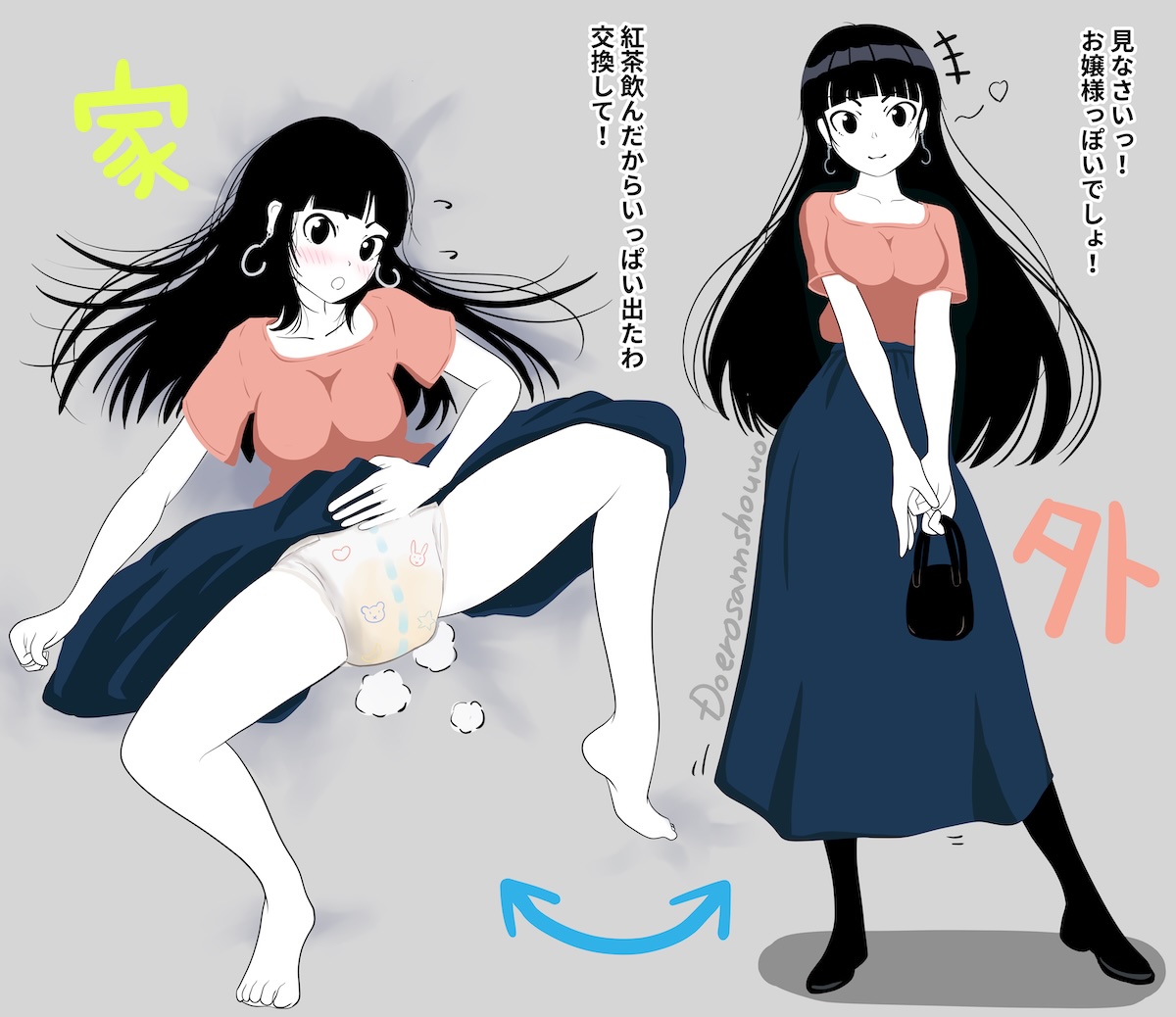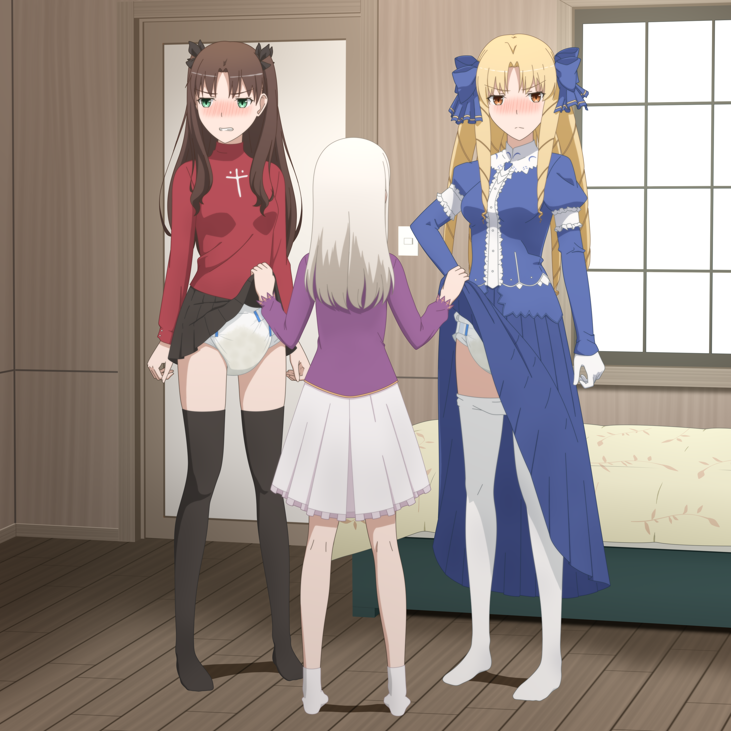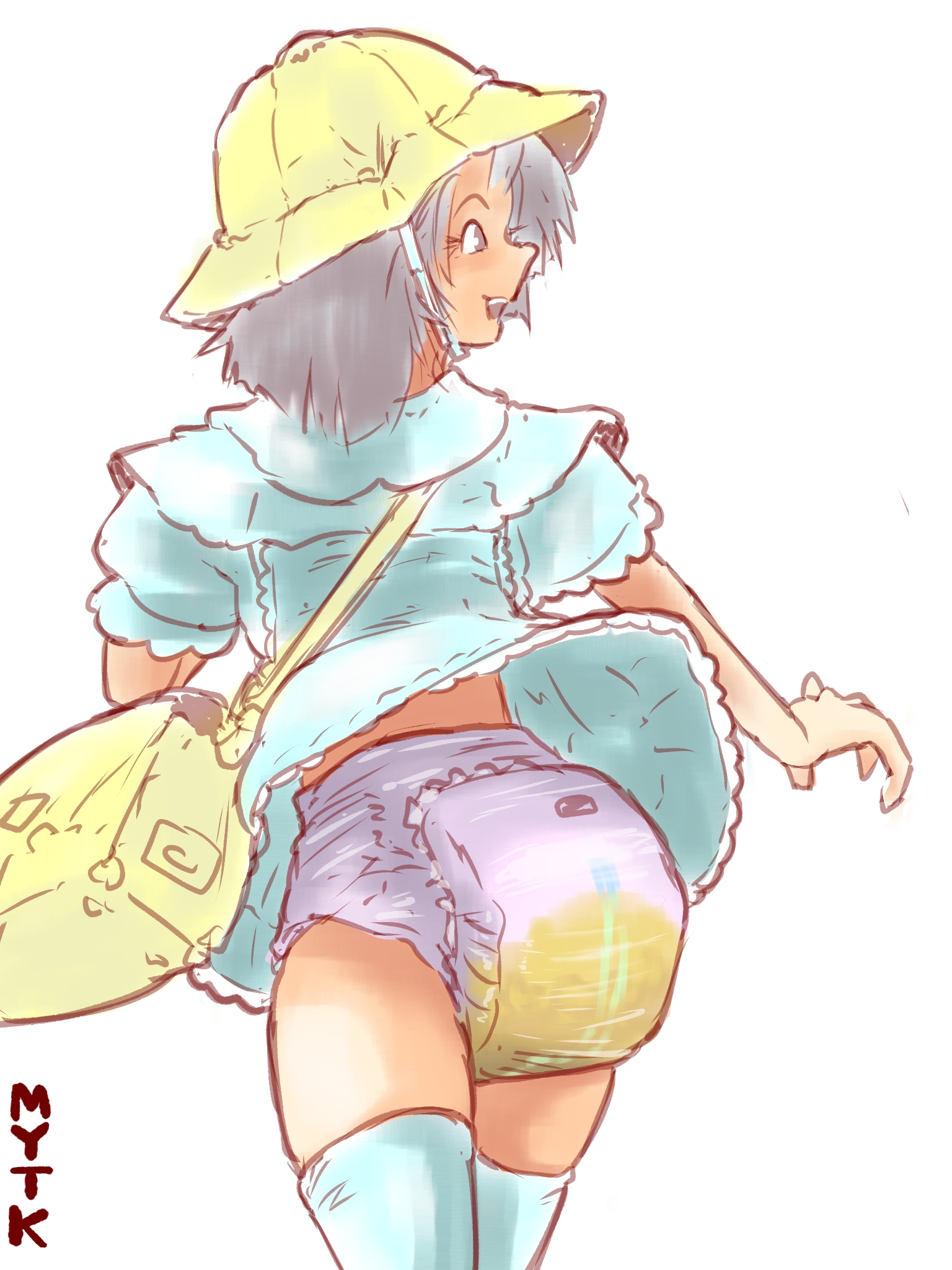 I'm in the minority and can't enjoy most diaper art. I only like them for the humiliation and cuteness aspect and not so much pee/scat. The only time I want a diaper to serve its intended purpose is for soaking up a girl's love juices. I like more subtle diapers, highleg with a bit of frills that could be mistaken for panties at a glance are my favorite. Combined with a cute miniskirt or tight shorts so they're always at risk of having the diaper peek out from the waistband or under the skirt. Either forced to wear them as punishment or a willing wearer who likes being pampered and cuddled.