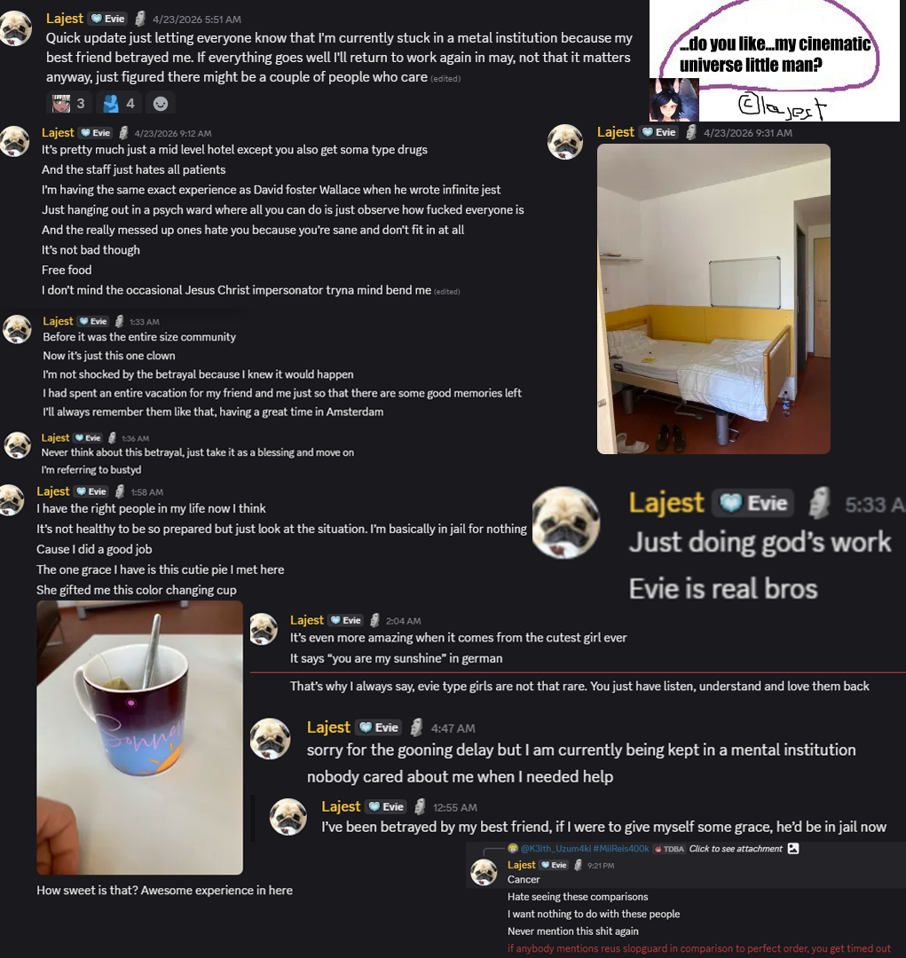>>11504311Missed out on bit, Also when is rest of the team going betray the big L? It's just matter of time.>>11504328Not only that he has it easy for him, he is literally slaving people away to work on his projects while not doing a single thing for month(s). He hasn't even worked on the game itself. Just other contributors animating.All Lajest has ever done is schizo post and crashout in his discord publicly lol