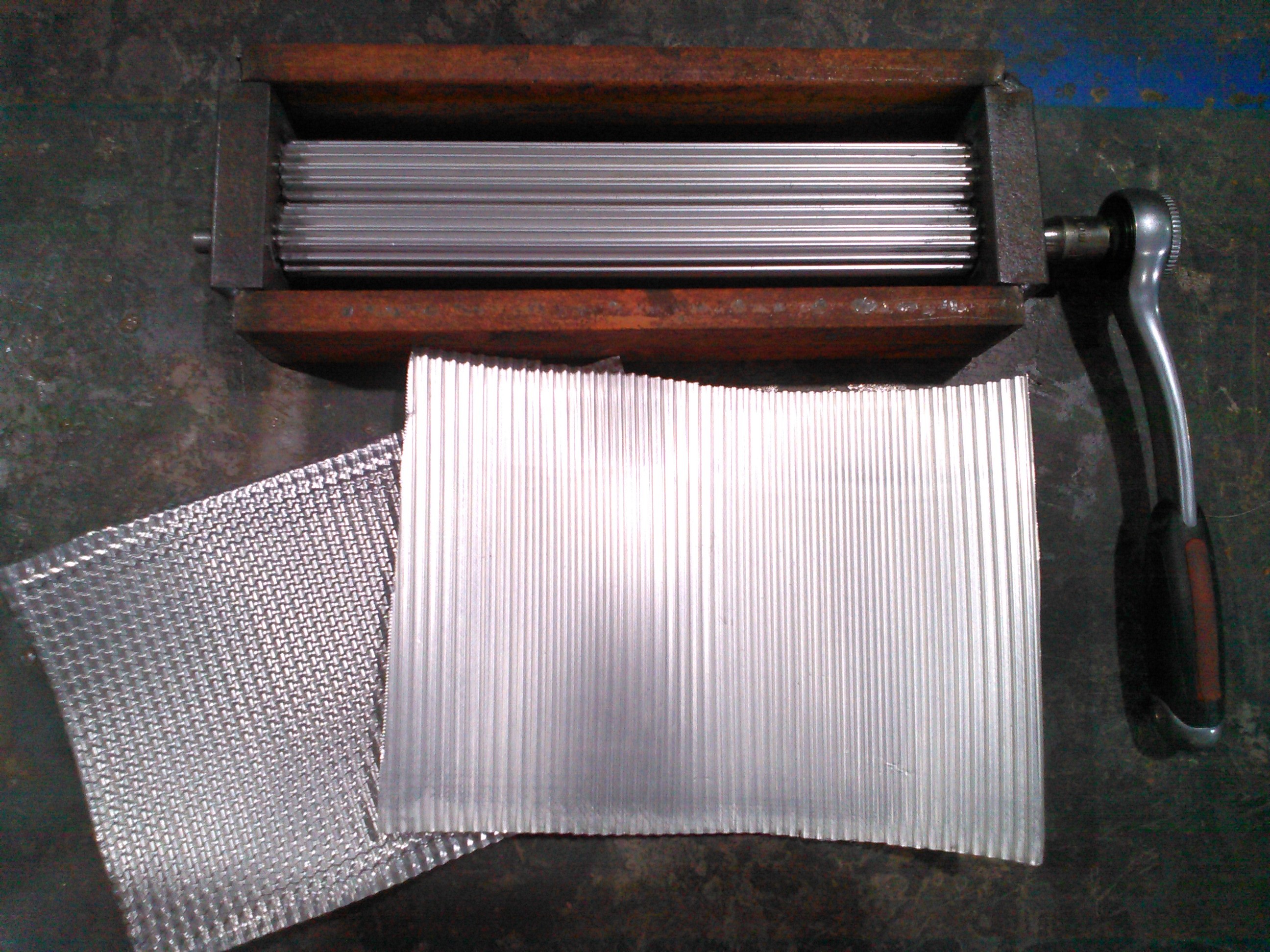 Well I made a thing today. Started with a fiskars paper corrugator, but it wasn't sturdy enough to corrugate a beer can. Knocked out the axle stubs and replaced them with some 1/4" drill rod and then drilled the end plates and built the frame. Little bit of lapping compound got everything running smoothly. Cleaned that out, greased it up, welded a plate top and bottom and added a 1/4" socket so I can run metal through with a ratchet. Works bretty gud. Top piece is a beer can ran through once. Bottom piece was run through once, then turned a 1/4 turn and run through again just to see what it'd do.