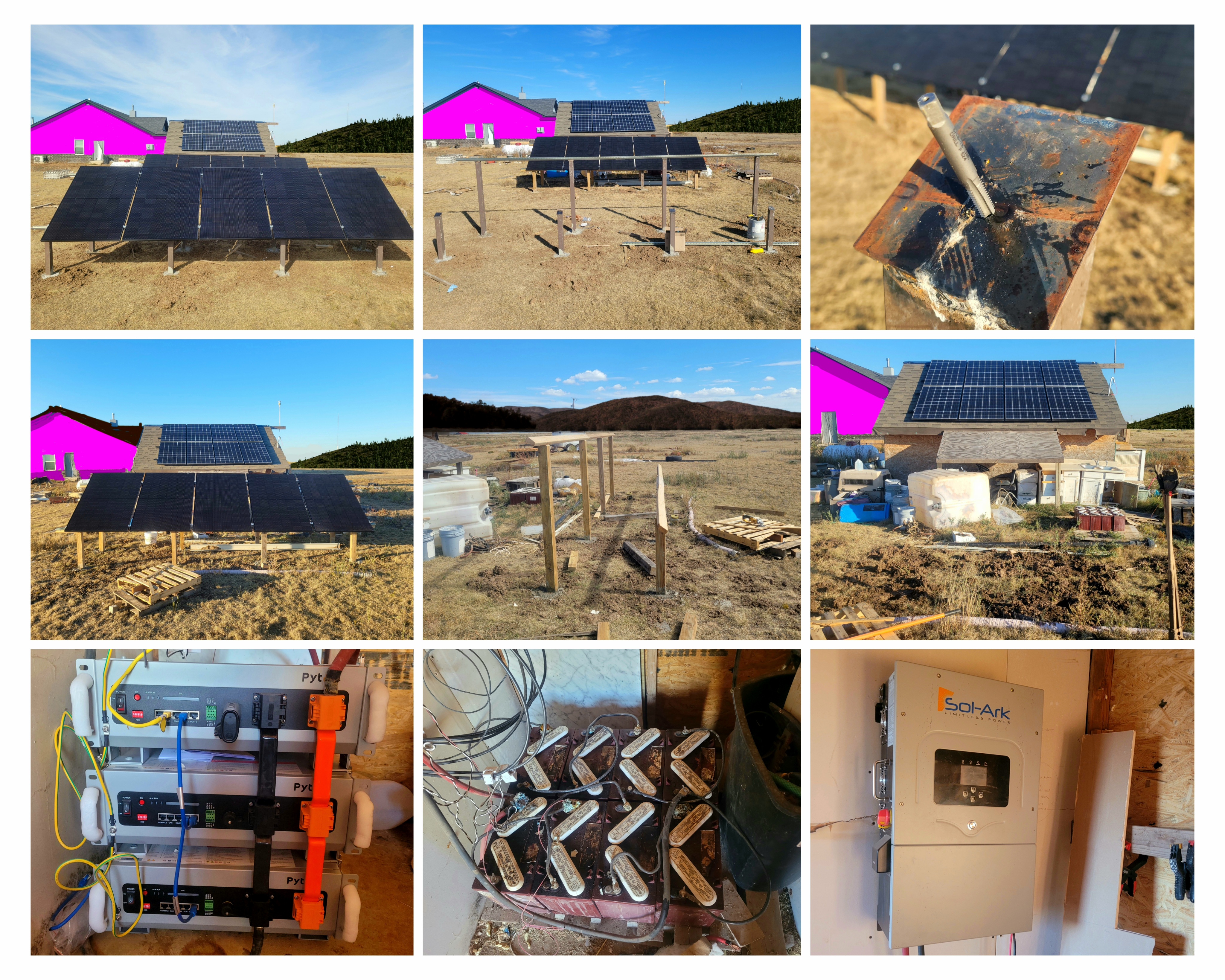 Project started in June 2024 at this house/location. prior to that, it was installed and in service at our old house since October 2020. we removed it when we sold the old suburban house in June 2023, it sat at the new house in storage while we built the equipment shed and just generally got settled in. reinstalled the original 2440w Qcells (seen on roof) & FLA Trojan T-1275 (750Wh usable) setup in June 2024. October 2025 I had finally saved up enough cash to purchase the upgrade: 10 additional Canadian Solar 445w monofacial panels & 3x Pytes V5 LiFePO4 (15,530Wh usable) storage. installation was done in stages. 1st weekend in October 2025 I installed the LiFePO4 batteries. over the following 2 weeks I built the 1st array ground mount frame structure out of reclaimed wood. I used unistrut for the actual mount rails. 3rd week of Oct. I ordered panel clamps and MC4 cable, wife and I installed the panels on that Saturday. first full solar day was Sunday 18th. on Friday 24th I began installing the 2nd 5 panel array mount, this time out of steel tube recovered from an exterior remodel at an apartment worksite. I cut and welded optimum solar angle steel plates on the posts & embedded in concrete. unistrut was used for rails, again. still had clamps from 1st install & ordered another set of MC4 cable to connect in series with the 1st array. today, Sunday November 2nd was the first full solar day with the complete 6890w array. this project is officially complete. PV array provides 5x our typical hourly load. Batteries cycle from 100% SOC to 35% taking us from 17:00 to 2:00 off-grid. we purchase Grid power for ~7 hours between 2:00 to ~8:30 totalling ~7 to ~11kwh nightly. our seasonal usages varies from ~20Kwh winter to ~50Kwh summer. I estimate that our system will cover ~85% of our annual usage. 85% reclaimed materials.pardon the rubbish in the initial project photo. I had to remove all everything in the shed to access building materials and installation supplies.
