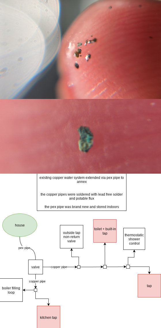 what the hell is this in my waterI recently extended my water supply line from my house to a newly built annexpic is a diagram showing what the system looks like, with red squares marking the areas where I've noticed the flakeswhat could they be? I've ran the taps for a long time and they still keep comingshould I install some kind of filter under the taps?