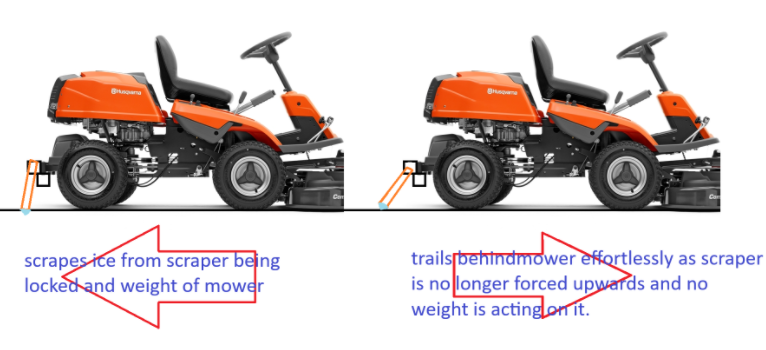 I’ve got my whole yard turned into a skating rink. Sand and gravel aren’t autistic enough, they just slide around on top of the ice and end up in piles. I’m thinking of making a rear attachment for my AWD Husqvarna rider that cuts when I’m reversing. Forward motion would be free-rolling and not digging at all.Basic idea is a hinged cutter plate / spike bar:>Reverse = mower pushes it down and loads weight onto it, so it scratches / grooves the ice>Forward = geometry makes it release and trail, so it can’t biteHas anyone built a one-way drag or scraper or something like this before?