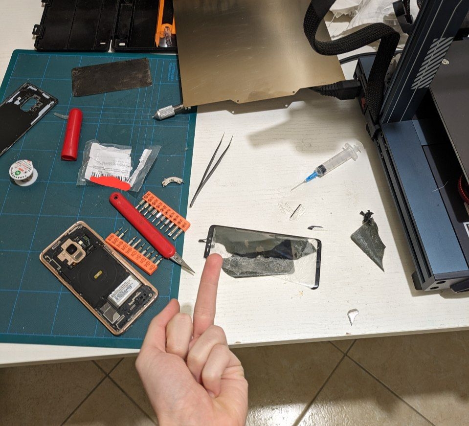 Today I experimented repairing my Samsung Galaxy S9's screen (I needed to change GLASS only, but not the oled).Since I knew it was gonna be hard, I installed lineageOS, activated USB Debugging and downloaded scrcpy on my pc.Everything started fine but went downhill fast, as I tore my oled while separating the glass.The screen doesn't work, but the phone is super fine and will now serve as a Raspberry Pi replacement with termux, probably will use it to install Klipper for my 3D Printer.