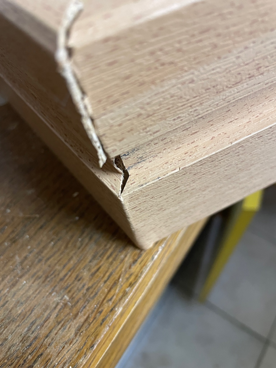Nice craftsmanship for a start! Really cool!…and now for something completely different:Industrial grade shit!That’s like the worst joint I’ve ever seen. Take the cheapest particle board, put a V-notch in it, put some fake, plastic veneer on it, fold it, done. Surprised me that it held for that long. For a used cabinet I got for really cheap for the kids room, it wasn’t a big deal, since that was an easy fix, but apparently, that’s a name brand cabinet that cost a few hundred euros. WTF, I’d be really pissed, had I bought this POS for full price.