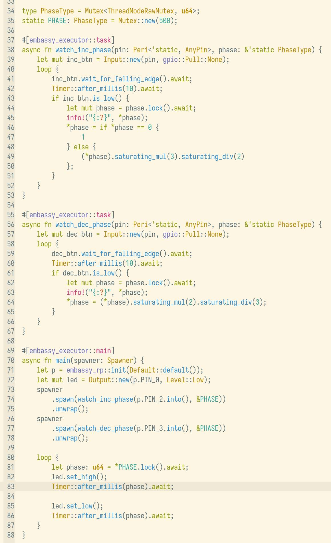 >>2958554> a programming language I don't know is unreadable for meWhat are you trying to say? Everything is unreadable if you're illiterate.But my point is not the syntax, which is fine; it's the ability to conceptualize your uC code as a collection of pseudo-parallel infinite loops communicating via mutexes or channels, each sleeping independently. All this for zero-cost performance-wise. That's a nice abstraction to have.>>2958563Yes, I'm trying to rewrite a two-button and an LED test project from scratch, shame on me.
