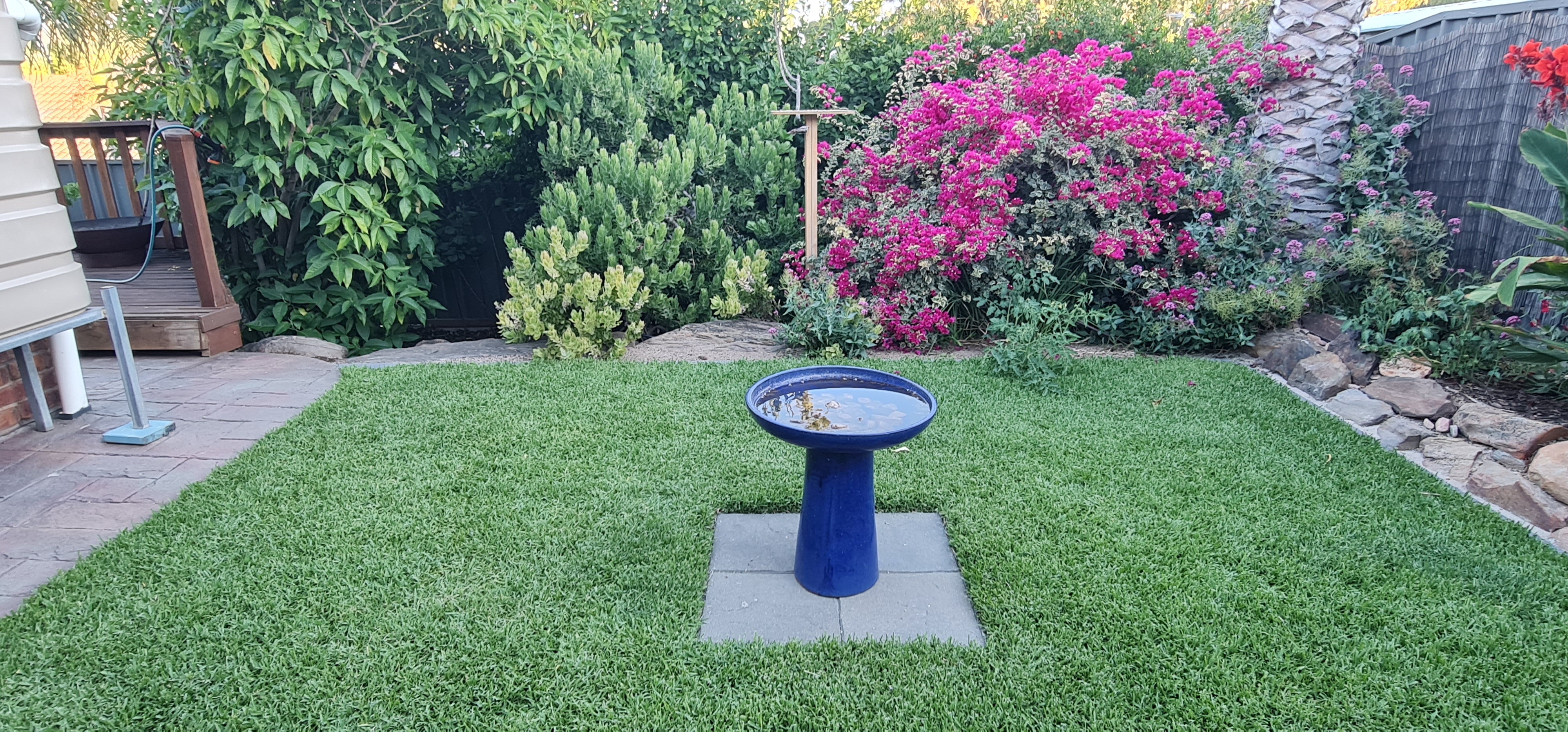 >>2961491The reason its dead center is because on the weekends we move the birdbath out of the way and put a little firepit there if we have people over. The reason its blue rather than natural is because we only got the place about a year ago and the previous owners left it behind so we decided to use it, I agree something more natural would be a lot nicer and perhaps something we'll look at changing in the future