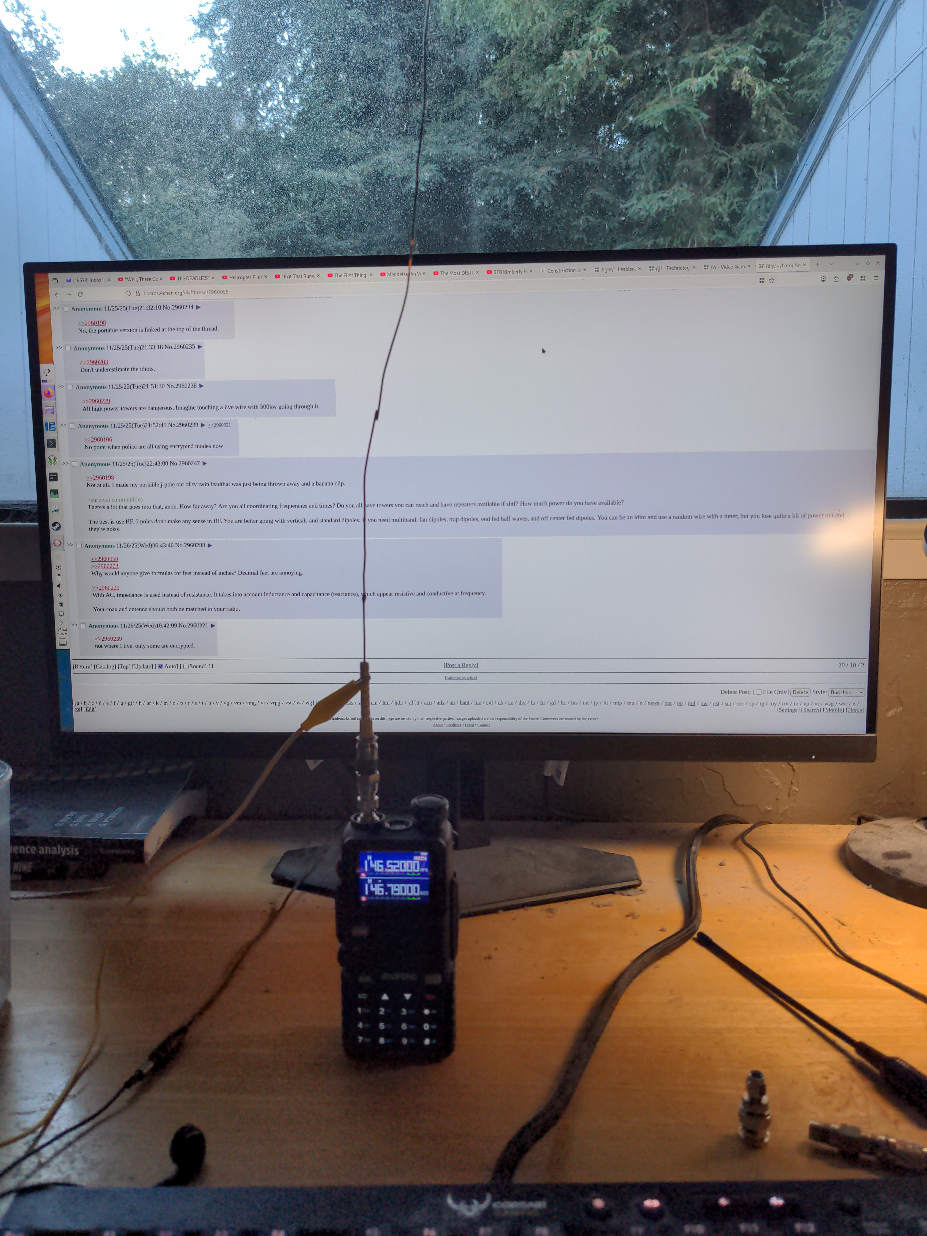 >>2963684Oh never mind it was that shitty coax alligator lead I guess. Or maybe it was an inconvenient length. Took it outside and vertical with no avail, but bringing it out front, propping it up on a wheelie bin, and plugging in the PL259 lead I ran under my house and it measured really well, both for impedance and for frequency, SWR was below 1.5 if I recall. The long lead means the graph is pretty jagged, I’ll have to buy some more PL259s, or at least a PL259 to SMA or BNC adapter.Trust the plan.