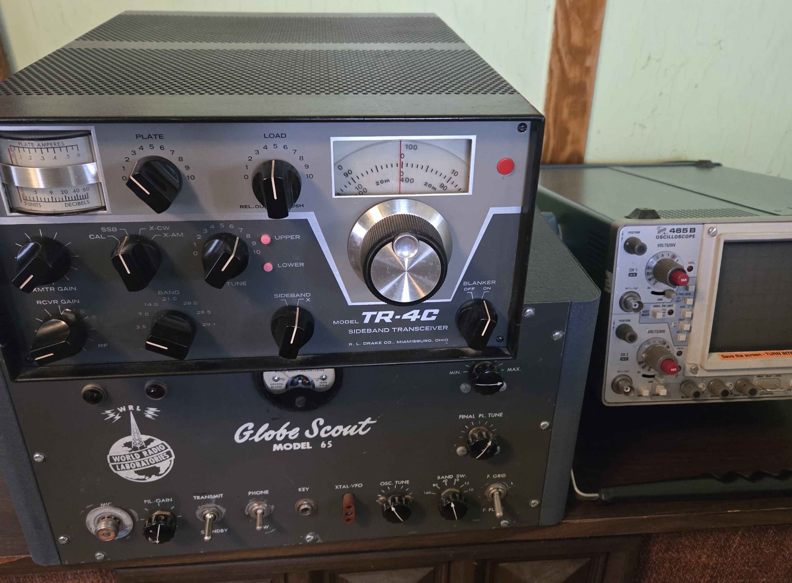I picked up some boat anchors today. >Drake tr-4cNeed to grab a power supply off of ebay to see if it runs >World Radio Laboratories Globe Scout 65 transmitter onlyI picked this up because it was made relatively close to me and it's as old as my parents. I plugged it in and turned the filament gain on and the vacuum tubes inside glow. 40 watts of AM or cw. Need to get crystals to set the frequency.