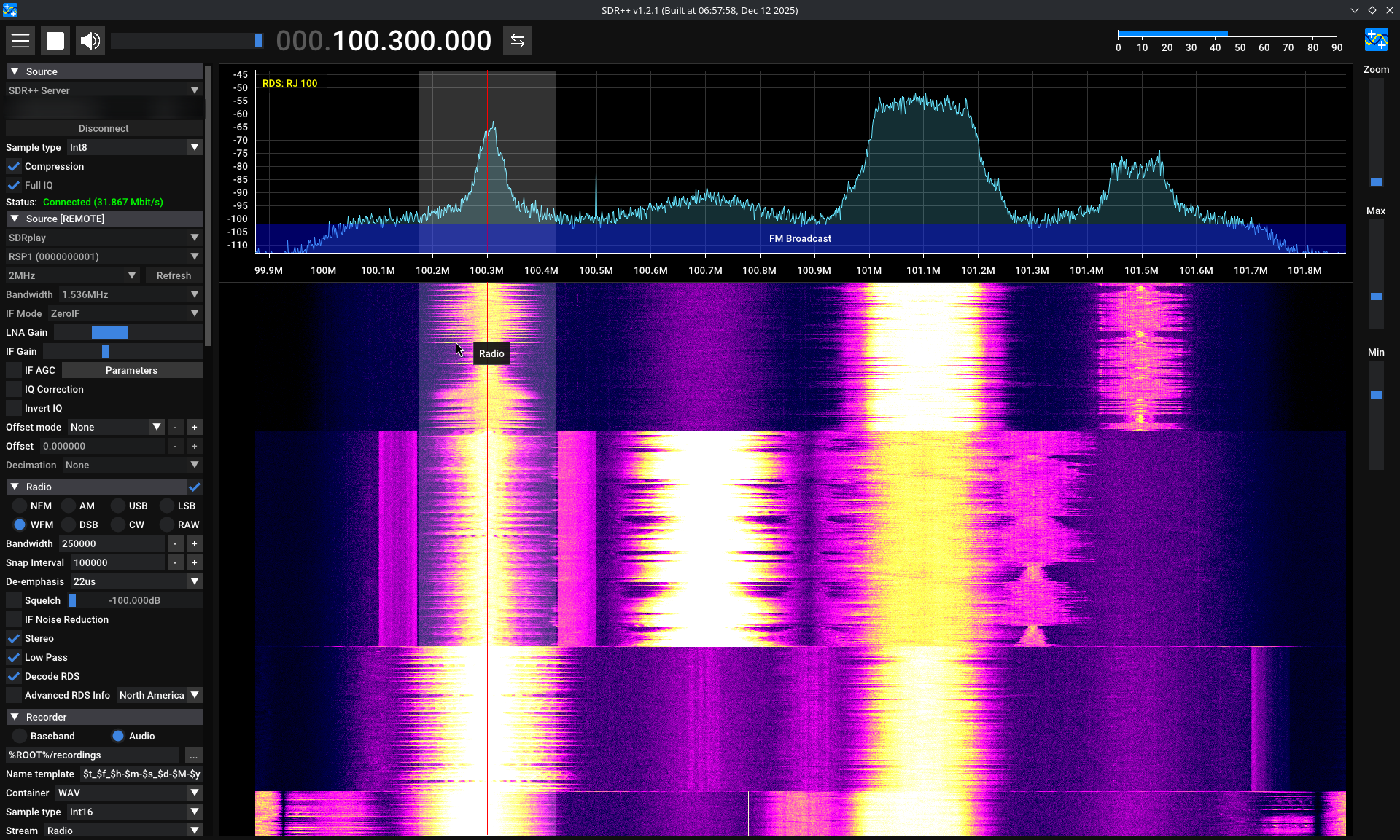 Correct. Sadly I'm now too far to get a reliable signal from it. RDS doesn't even come through but I can hear it cutting in and out. I'll be able to remotely connect to my SDR to listen once I get home though. There are 3 stations where I'm at now but none playing good music.
