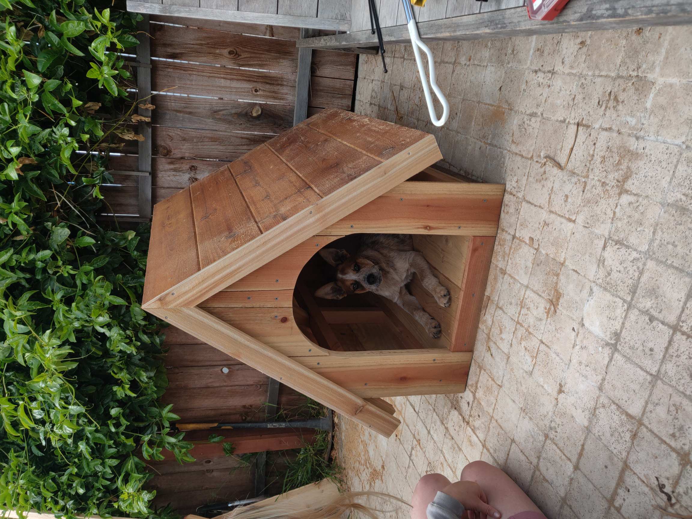 >>2964278And here's my pup chilling in it once I put the cedar roof on. I wish I'd used a 15g nailer for the siding but I'd left that tool at work that weekend so instead I have those misaligned screws lol. But honestly he barely even uses it now that he's older so I might end up getting rid of it. Fun project though.