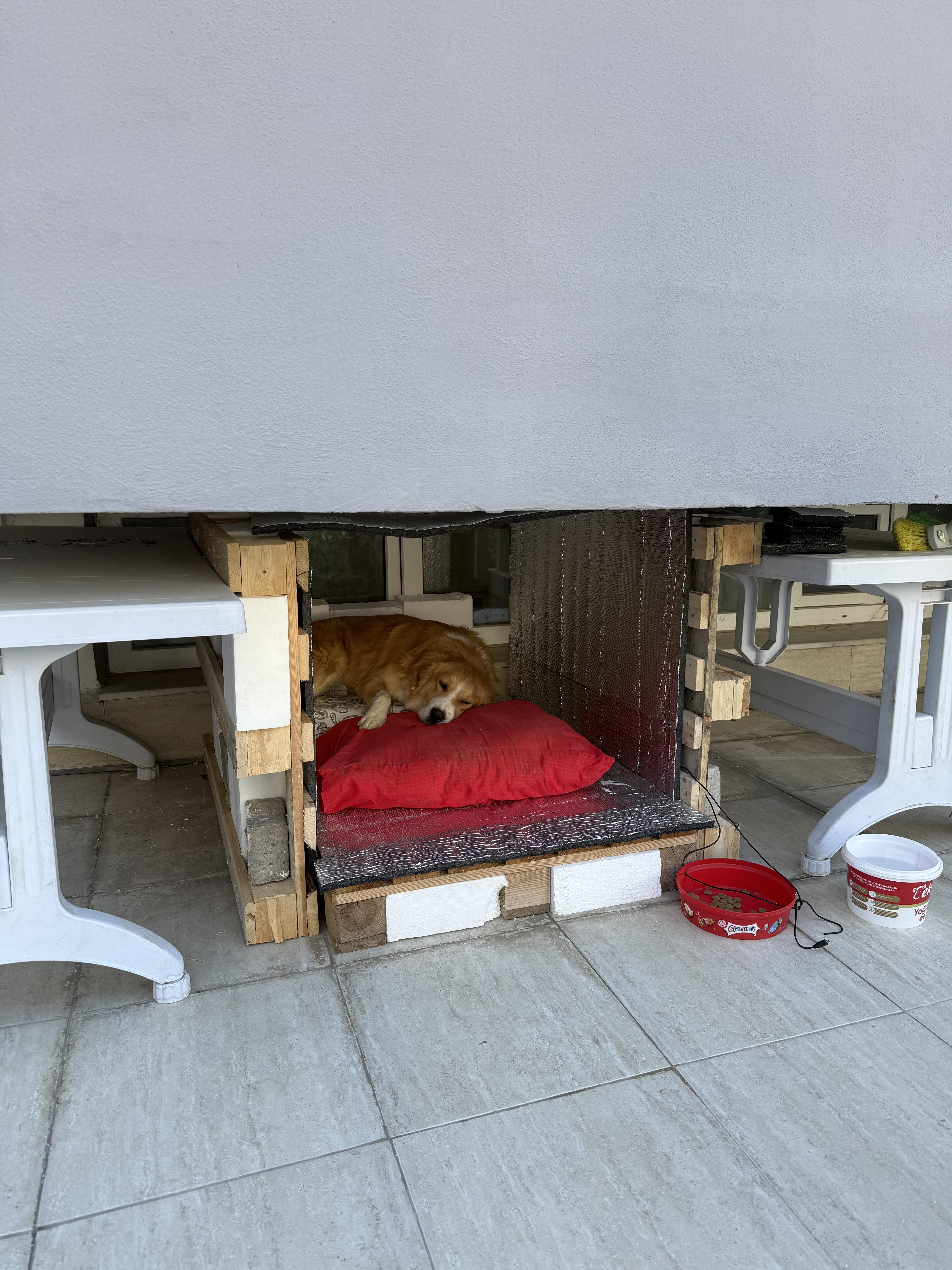 >>2964337Enter the evolution of the doghouse... While you mongoloids are stuck in your world where a dog house has 3 sides and a roof I decided to go with a more modern and minimalist approach.I got 3 pallets, put some styrofoam in the gaps, and nailed some radiator insulation to the pallets. Then I used some cinder blocks we already had and some tables we weren't using to stabilize the walls (I'm not 100% happy with the stabilization setup but it works, might nail the sides to the floor but I wanted to see if the dog would actually like this first)All in all it took like 30 mins of work. 3 pallets 300 TL, 6 foam pieces 200 TL, nails 50 TL, 6 sheets of radiator reflection insulation 1,680 TL, total 2,230 TL aka ~$52. The radiator insulation is what blew up the project budget but still it's cheaper and bigger than a pre built doghouse (like 4,000 TL around here)
