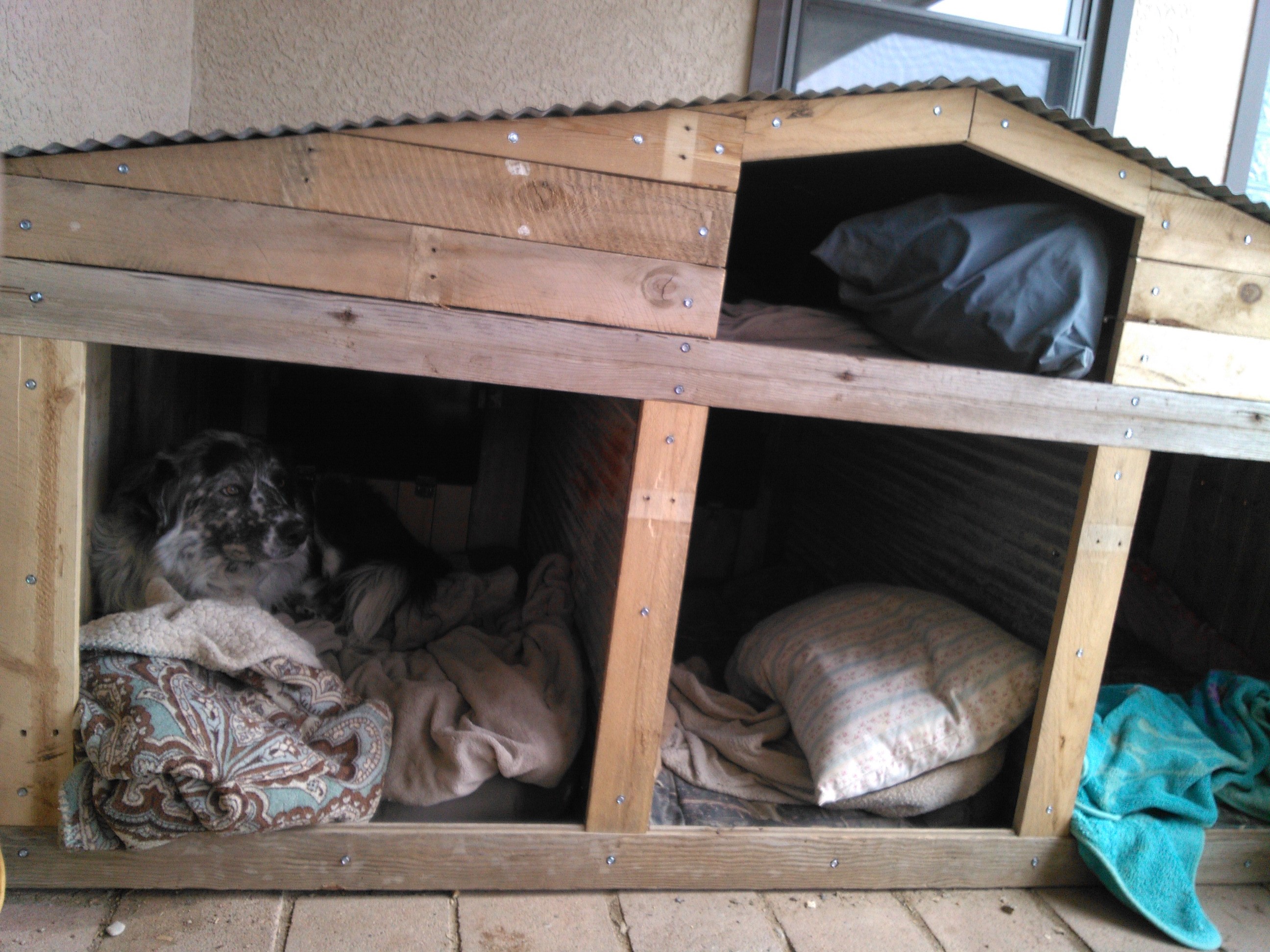 >>2964277>>2964278>>2964279Thats a nice lookin dog house. Good job. I've built a couple with steel frames and pallet wood siding. This one is a 3 unit dog condo with an upper cattic loft. All 4 have infrared panel heaters in the back that run to a temperature senor to run them when it gets cold.