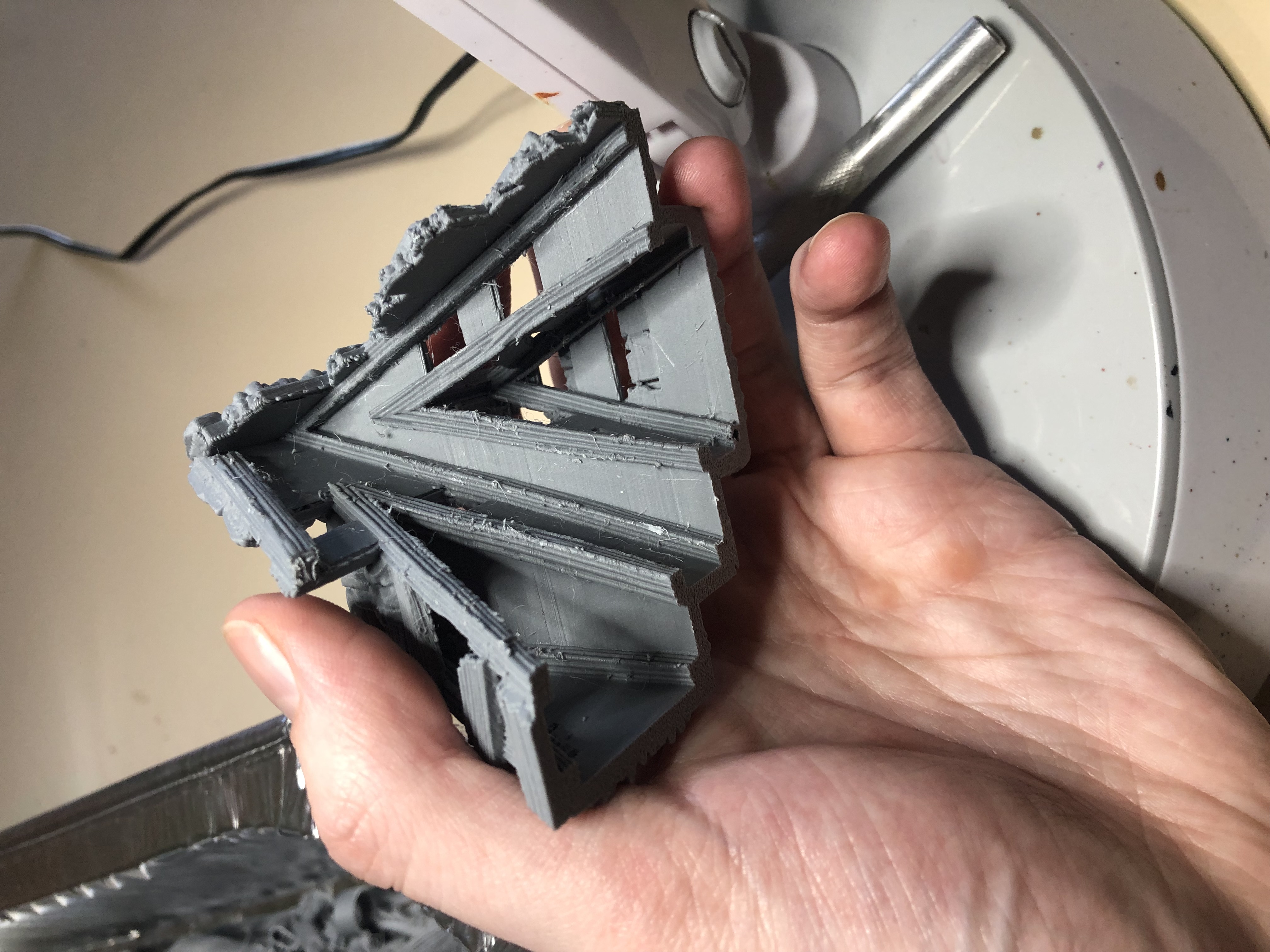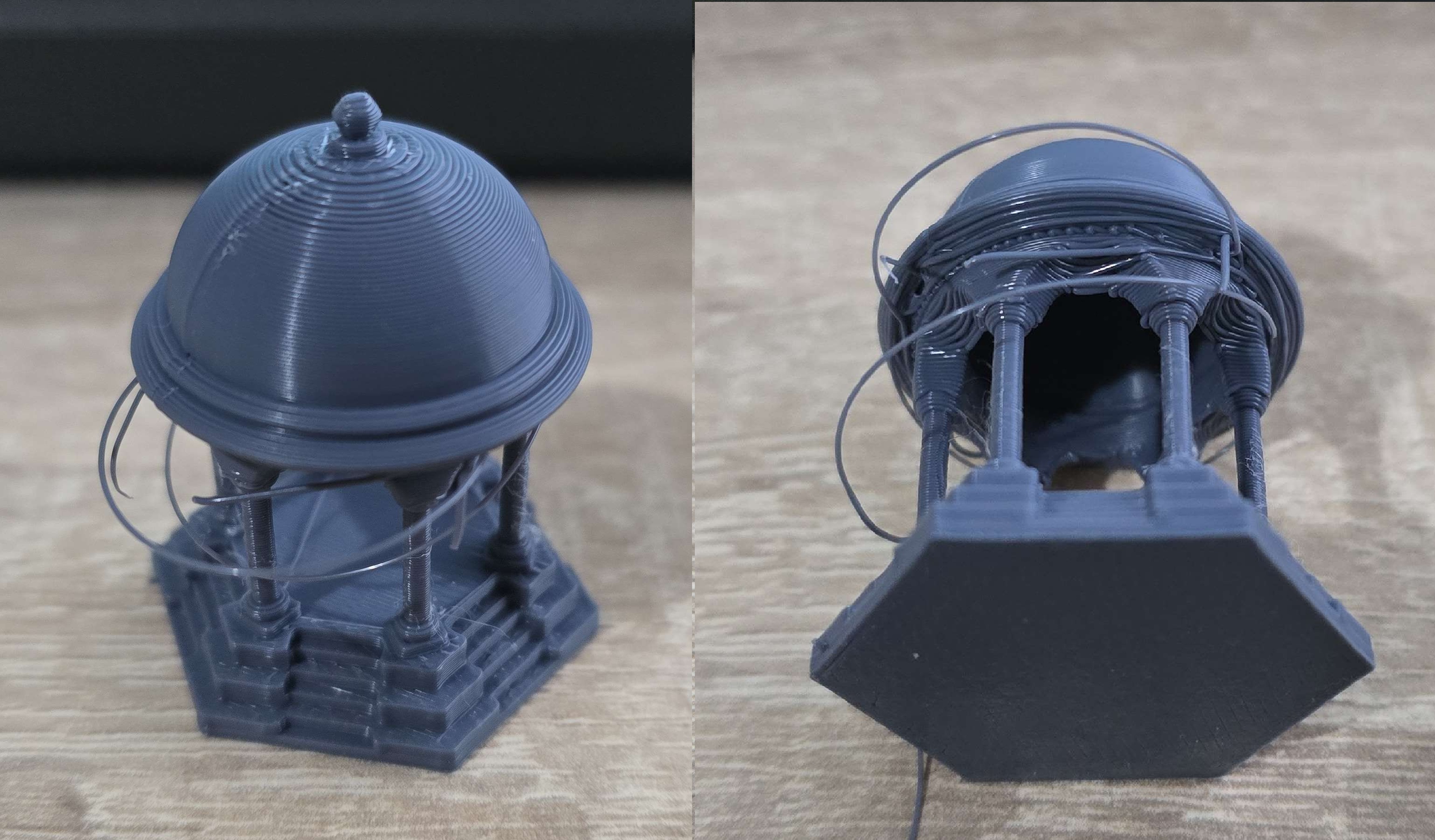 >>2965130>>2965123>How do you know which parts of an FDM print need supports?There's a bit of an art to it and the slicer (probably) does some guessing, so reslicing it might generate different supports.I don't know Bambu Studio so I can't say how it does supports but those wavering towers are actually an attempt to minimise support contact with the structure. It's how the slicer can ensure something is supported when it overhangs the edge by just a little bit, it starts off with a larger support further away from the structure and walks it in at a stable rate, reducing the size of it as it goes and then just reaches out at the end to the thing that needs to be supported.It's meant to make it easier to cut supports off and minimise damage doing so.If you look through detailed options in the slicer, you should see some that are like:>max angle that requires supports>max overhang that requires supports>min distance from support tower to printGo through those and see what sort of things influence the slicer's decision to generate supports.You can use a support calibration test (as in find a print that's designed to test supports) and print it with a few different settings like the ones above and see what works and what doesn't.Or you can just leave it on auto and it will probably be fine.>>2965131>>2965131>babby's first prints. Quality is… eh?It's pretty good, what's up with the one on the right? That looks like it ended up significantly worse than the other two. Something to do with layer height maybe.The one on the left looks like you maybe want to reduce layer size or...I'm not sure how but there might be something like z-retract or z-hop that would reduce the obvious layer lines on the diagonal braces. That's probably a difficult part to print smoothly, the sides of the print look fantastic.I can see a little stringing here and there, messing with temperature is usually the way to fix that.The one in the middle/rear looks great.