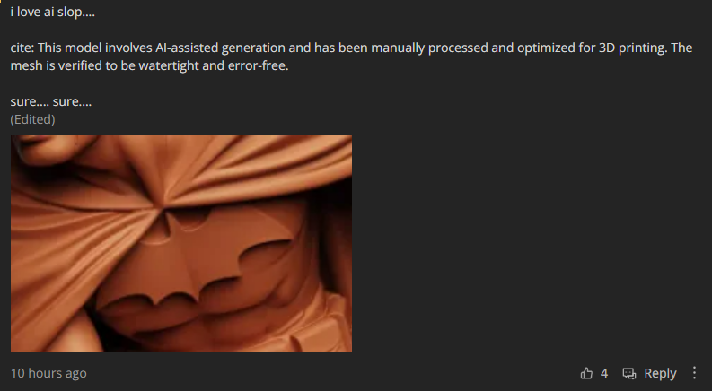 >watch a techtuber who buys a 3d printer for functional prints>prints a giant pla bin>"ah the print is finished">the part slides off a textured plate with 0 resistance>basedface reaction of surprise at how good it turned out>stringing>corners lifted off the bedthis is someone who sells themselves on being authentic and they're out there faking reaction shotshttps://www.youtube.com/watch?v=8SWflLuj8YY&t=722s (12m02s)cant fault a noobie for not recognizing a shit print but the reaction is atrocious