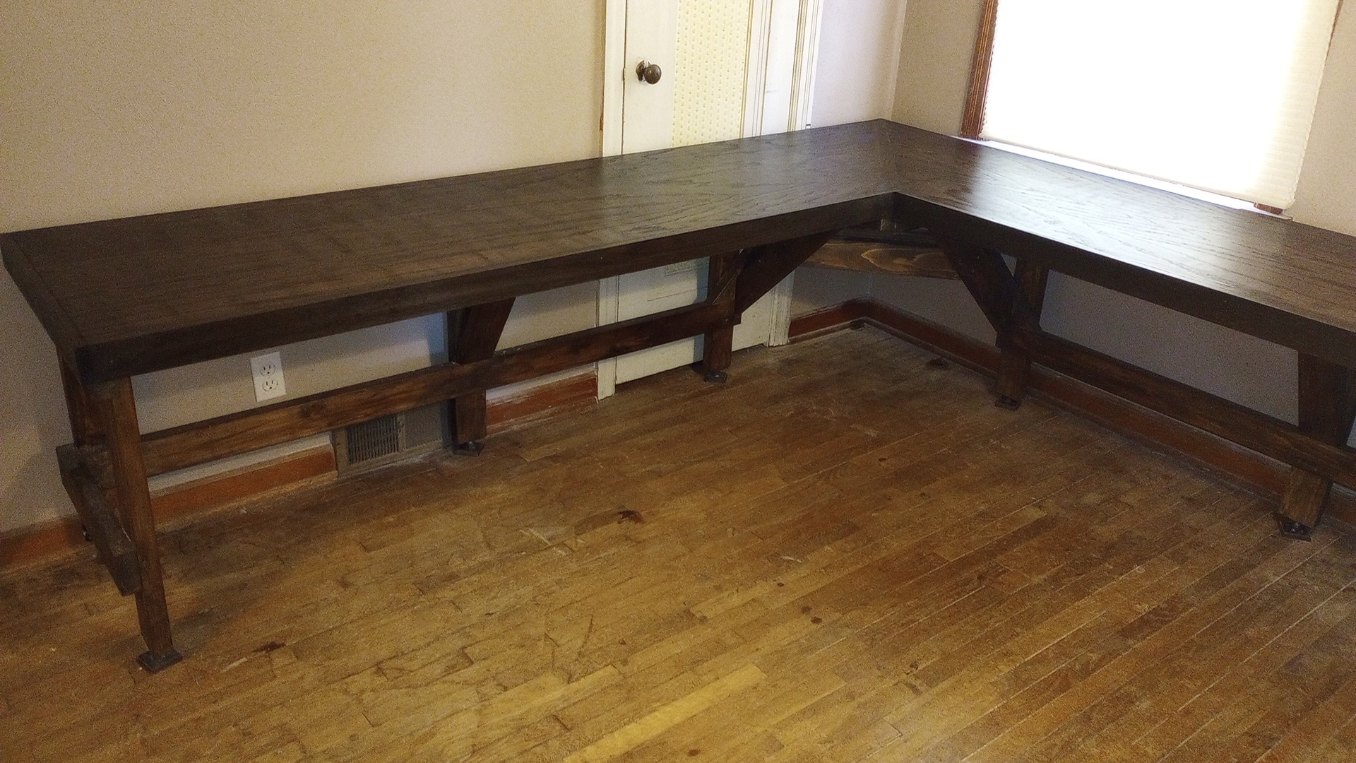 Got the tabletop all sanded down, and I'm just waiting on my finish to get here. Legs are welded up and all painted. I'm hoping I don't mess anything up when drilling for the threaded inserts.>>2967232That's a good idea. I did see the gallon containers, but I wasn't sure if it was the same. Also, a gallon is a lot lol.