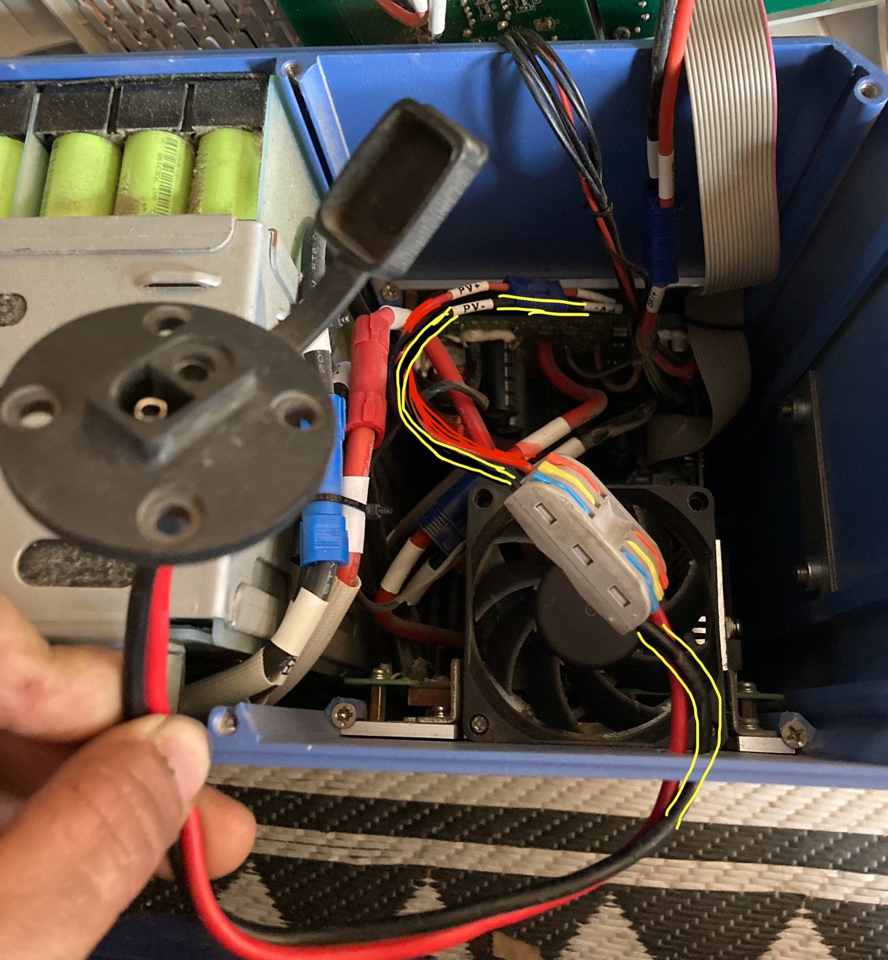 so i reconnected it back to the way the previous owner had it jimmy rigged to work directly off solar(pic 3/5)>colored lines drawn for clarity, hope they help and not make it worse.