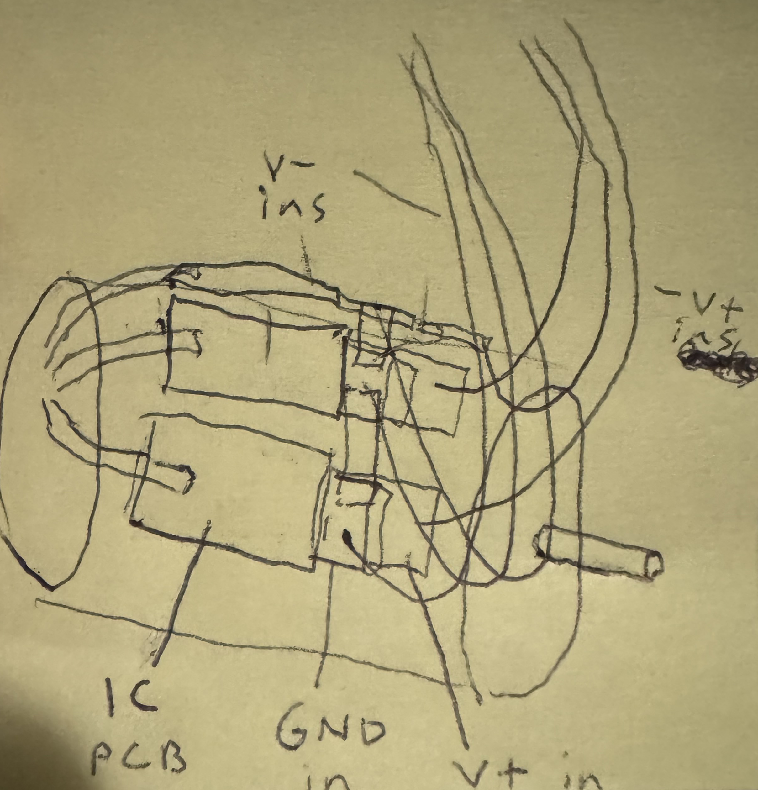 So as I fast approach motor controller wiring phase, I figured I would revisit placement again. Upon further reflection I decided hovering midair motor controllers attached to nothing might not work as they'd perhaps be a bit in the way of getting at the motors and just be a bit overwhelming. I'm not positive on this and could revisit the concept but for now I'm thinking of just mounting it side saddle onto the motor again. I decided to place them side by side with inlets on the output shaft end and outlets on the BLDC motor wiring's end. I drew this sketch of the layout and wire flow as a visualization aid.