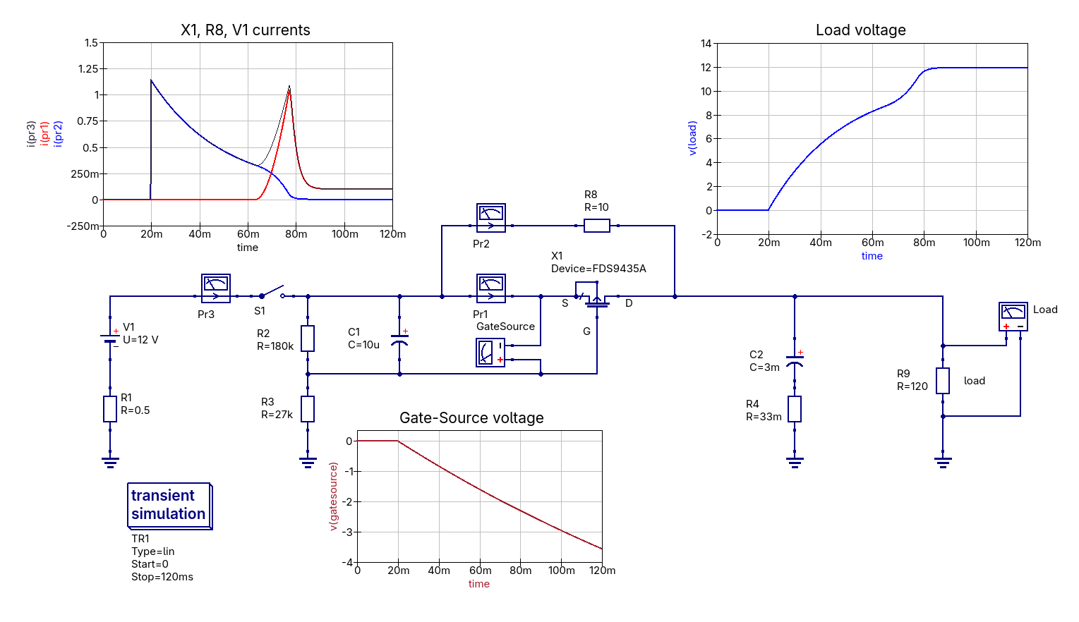 On the other hand, 10µ electrolytic G-S cap, large R1&R2 and 10R series resistor can limit the surge down to 1.2 A. I just wonder if X1 & R8 would be vaporized by having to dissipate over 10W for tens of milliseconds.