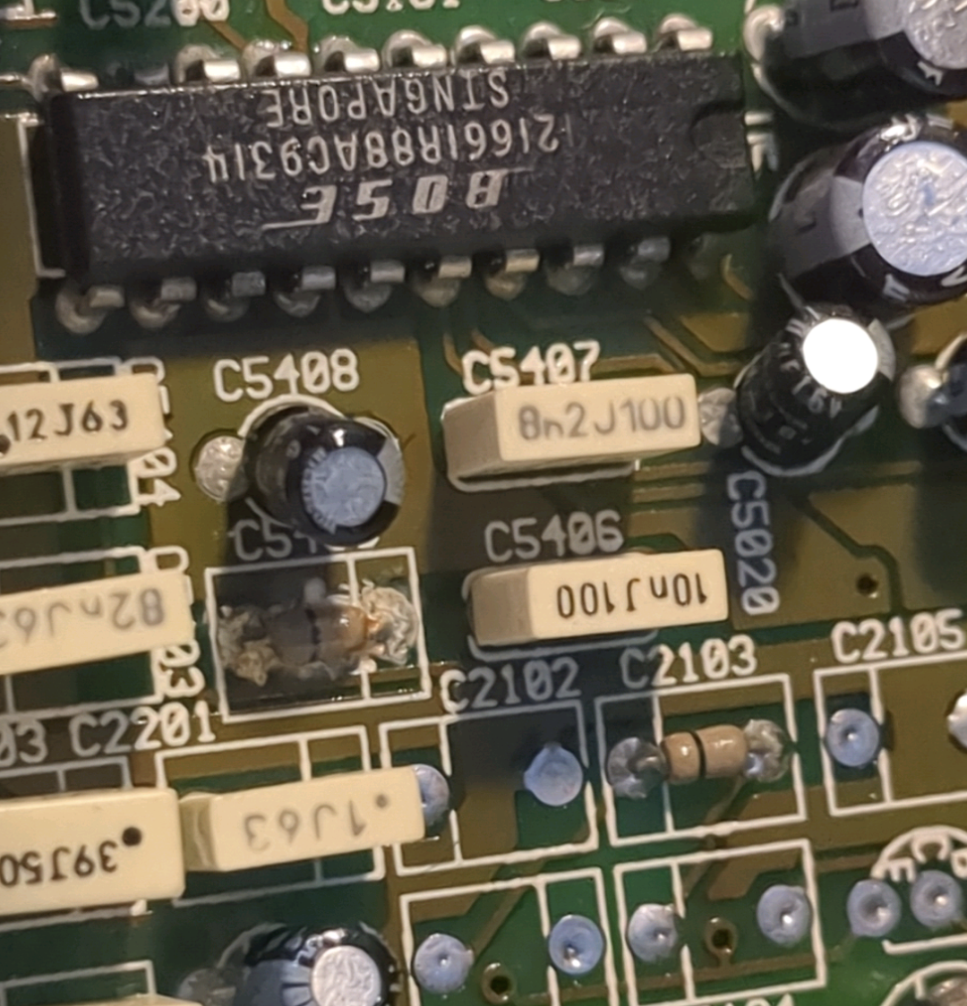 I want to replace this corroded component in my Mercedes R129's radio amplifier. The car is making a constant high pitched speaker noise I think due to the amp, although it does have an old aftermarket stereo. Based on the C#### adjacent to it I am assuming it is an axial ceramic Capacitor. It looks like its identical neighbor C2103.
